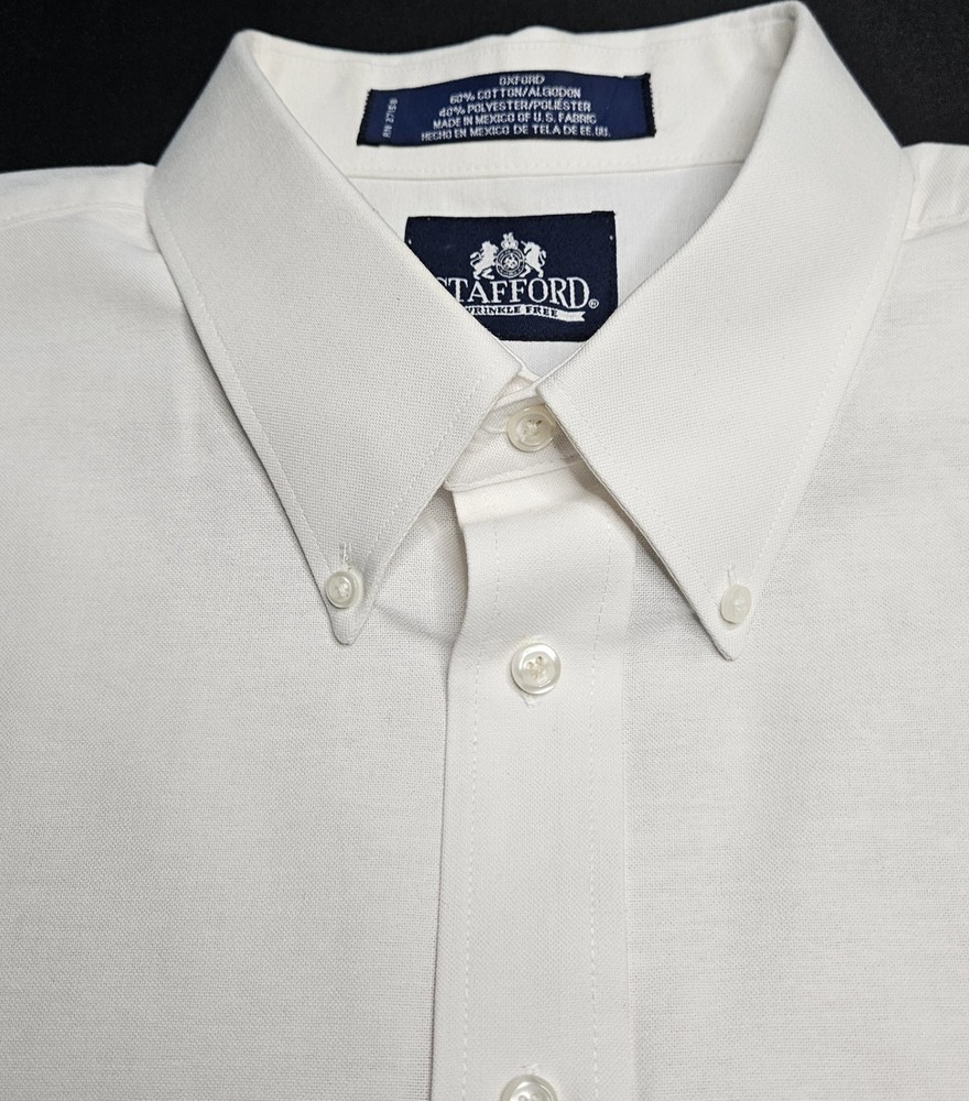 Mens Stafford Wrinkle Free Oxford Long Sleeve White Button Up Shirt 17 1/2 34-35 60-40 cotton/polyester blend Great looking white long sleeve button up shirt Wrinkle free oxford Pocket Little heavier feel to it Excellent used condition VERY NICE PRE OWNED SHIRT FROM SMOKE FREE HOME. FAST SHIPPING WITH THE TRACKING NUMBER PROVIDED.