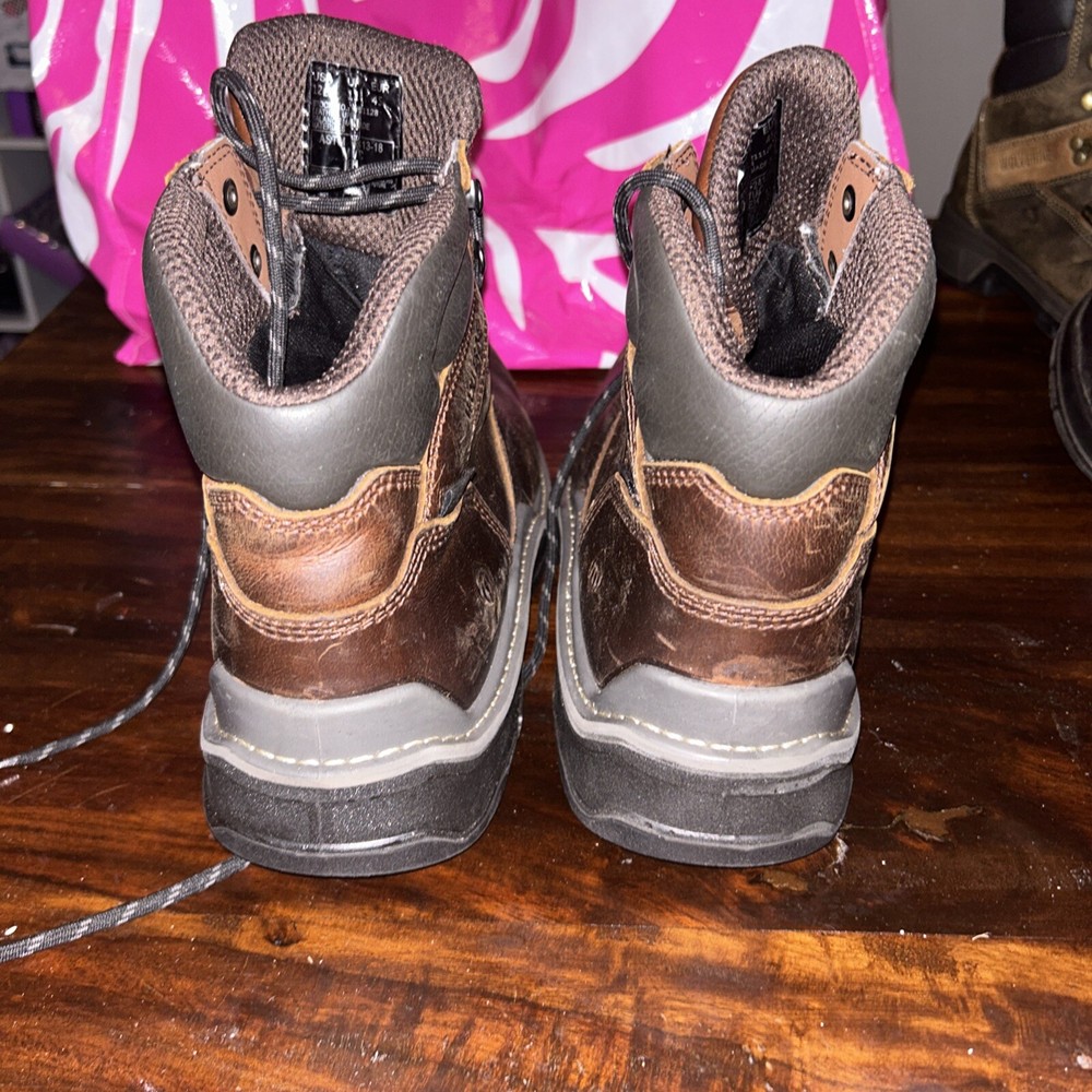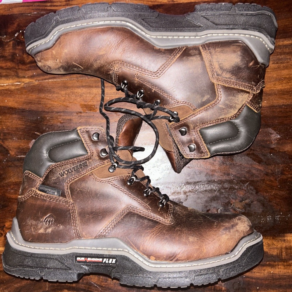 The product is a pair of men's work boots in size 12 with a wide width (EW), featuring a steel toe for added protection in hazardous work environments. The boots are designed in a brown color with a bootie style, ideal for providing ankle support and comfort during long hours of work. Made with leather upper material, these Wolverines brand boots are durable and suitable for demanding work conditions. As is! No refunds