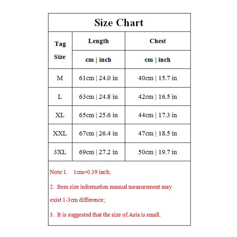 Description Feature: 100% Brand new and high quality Style: fashion,sports Size: M,L,XL,2XL,3XL Gender: men Color: white,red,blue,black,green,grey Material: polyester Sleeve length: sleeveless Thickness: thin Neckline: o-neck Length: hips Pattern: solid Season: summer Occasion: sports,gym Garment:Hand washing or machine washing,line dry. Package:1pcs vest Note: 1.Due to the light and screen difference, the item's color may be slightly different from the pictures. Please understand. 2.Please allow 2-3% error due to manual measurement.Please make sure you don's mind before you mid. 3.Size doesn's fit all.Please carefully check size chart and select the size based on your real size. On Dec 17, 2024 at 01:55:56 PST, seller added the following information: