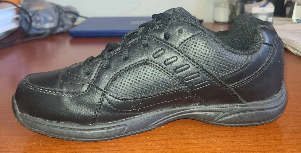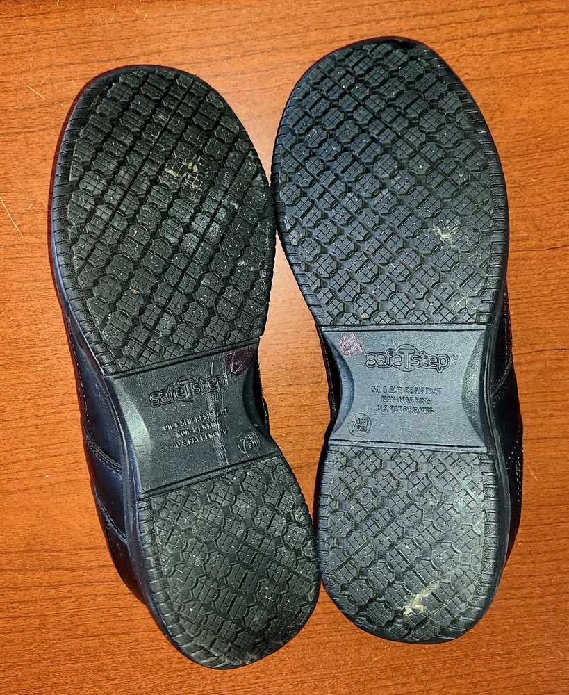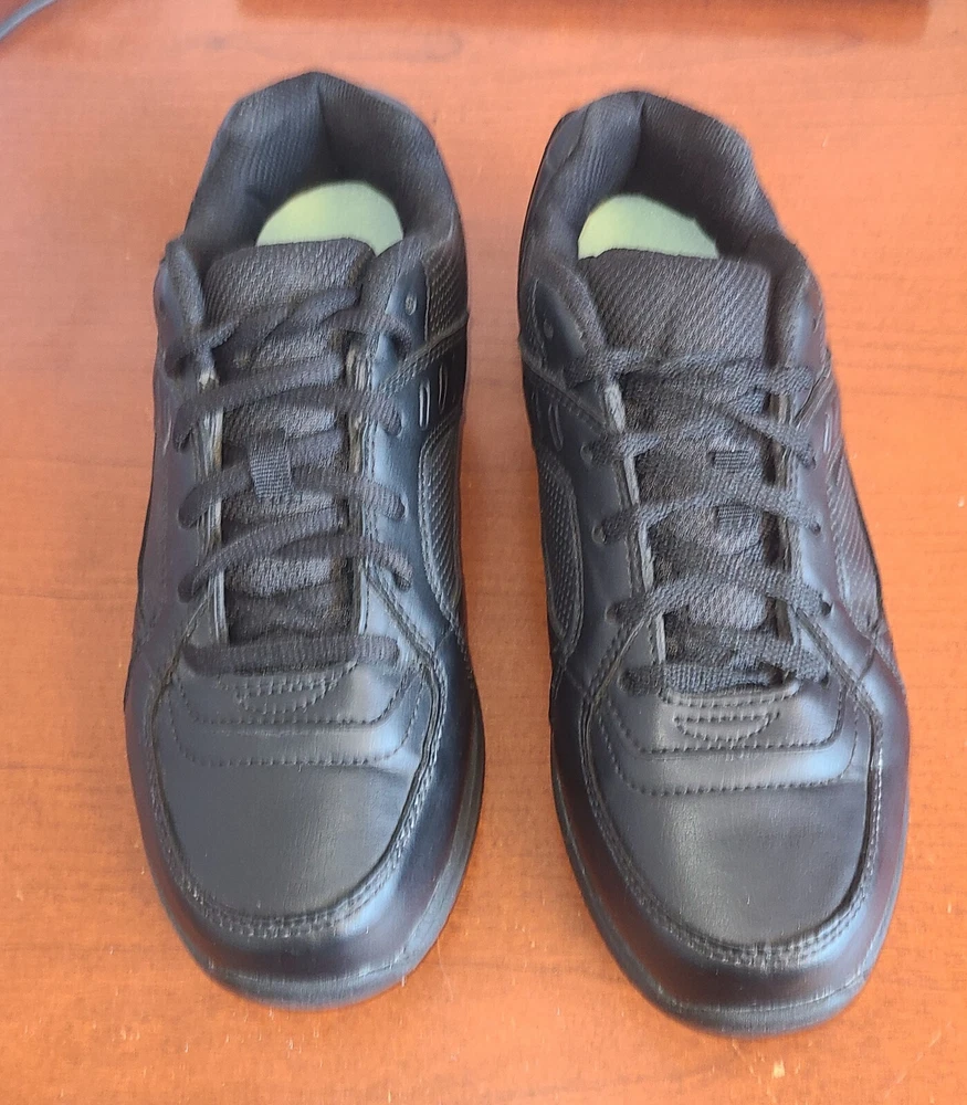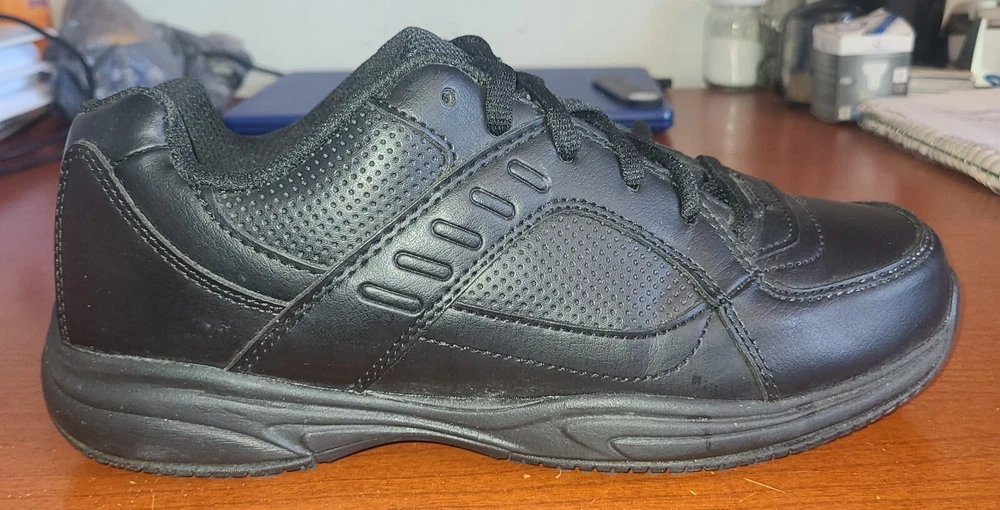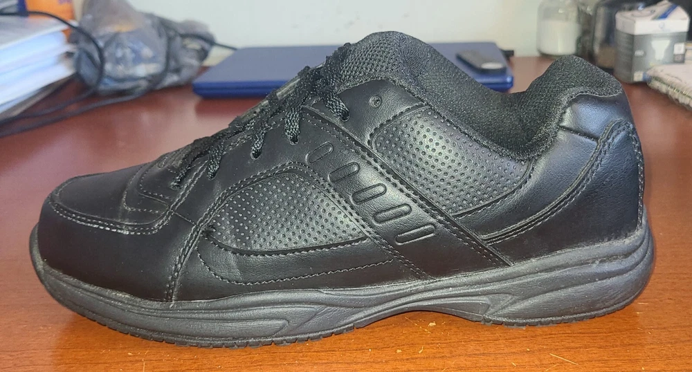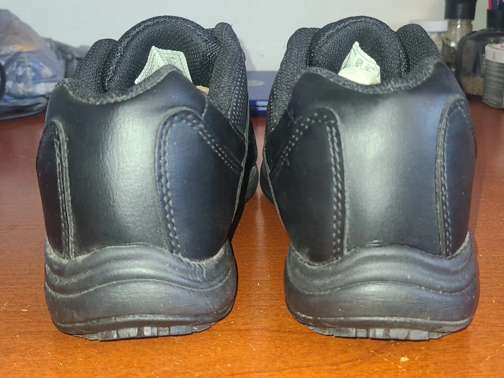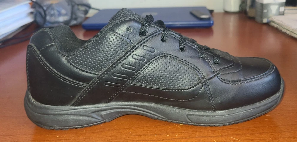 This pair of Safe T Step Comfort Work Shoes in black is perfect for men who are always on the go. The lace-up closure ensures a secure fit while the slip-resistant feature keeps you safe and stable while walking or working. The shoes have a round toe shape and a solid pattern that makes it suitable for casual wear. The upper material of the shoes is made of leather which adds durability and style. The shoe is available in size 6.5 UK, 7.5 US and 40 EU. It is a casual sneaker style with a wide shoe width that adds comfort to your feet. The brand is a reliable choice for footwear, and the shoes belong to the casual shoe category.