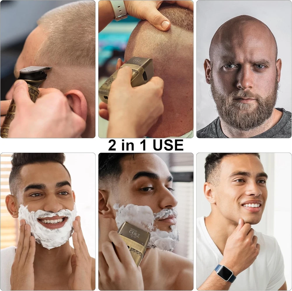 T-Blade Hair Trimmers & Electric Shavers for Men Foil Shaver Beard Trimmer Men's Grooming Kit with Triple Blades Cordless 2 IN 1 Trimmer Kit : Professional hair Trimmer with foil shaver set is a nice choice for home users and barbers to use.Both are awesome and the foil shaver can clean quickly,hair Trimmers are practical and can meet the needs of shaving hair, beard and other body hair. Powerful Motor : Hair clippers and razors are powered by a high-performance motor. With 7500RPM and sharp blade, our machines can easily handle even the thickest and coarsest hair. Plus, our metal construction adds a touch of luxury and durability to your grooming experience. LED Display&Travel Lock:Both the electric shaver and hair trimmer come with smart LCD displays, featuring a one-touch switch and clearly displaying battery percentage, cleaning reminders, and travel lock symbols for added convenience. IPX7 waterproof design allows for easy cleaning and maintenance. Protable & Long-Lasting: With a built-in rechargeable battery, Charge for just 1.5 hours and get up to 180 minutes of cordless runtime. our grooming kit is easy to take with you wherever you go Use Easily: Whether shaving your head, trimming your beard, shaping your sideburns, or grooming your chest hair, this hair trimmer &foil shaver set delivers an exceptional experience.