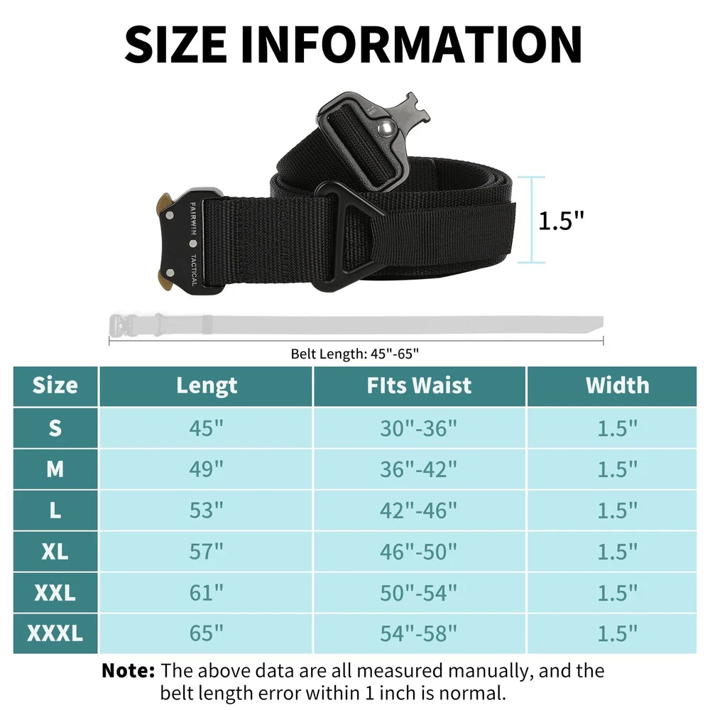 【 1.5 In Tactical Belt Size 】Length: 45”(115cm), Width:1.5”(3.8cm), fits waist 30"~ 36". Buckle Size: 2.4"(6cm) in width and 5/16"(8mm) in thickness. But if you need 1.7" width rigger belt, please search B07GPHSKQF. 【 Men Work Belt 】This is work belts for men, it suits for Military, SWAT, Fire fighters, Worker, Rigger, Police, Law enforcement, Conceal carry, Armour military, tactical ninja, covert tactical, military essentials. Anyone who need to take any activity will be in harmony with this combat belt. The mens belt can also be used as daily casual belt, like pants, jeans, golf. More men’s belt usage scenarios are waiting for you to unlock. 【 Men's Utility Belt with Quick Release Buckle 】Just single hand can squeeze and release the belt buckle to easily unfasten the belt.Intuitive and smooth quick release functionality when you push the golden tabs down at the same time. If just one tab is engaged, the connection will still hold and fully re-lock on its own. 【 Tactical Web Belt 】The tactical nylon belt made of high strength, fast-dry eco-friendly 1000D nylon material. It’s breathable and very comfortable for daily use. 【 Belts for Men Riggers Belt 】This military belt attached a heavy duty military buckle made by aluminium alloy and a convenient V-ring for attachment of gears and accessories. Max bearing weight 1100lb/500kg. Widely used for military training or outdoor camping expedition. 【 Mens Tactical Belt Shopping Warranty 】Want Tactical Belts for Men and Women? Choosing belt means you won't be disappointed, there will be surprises! If you have any problem of these nylon web belts, please feel free to contact us. We promise to provide you satisfaction guarantee.