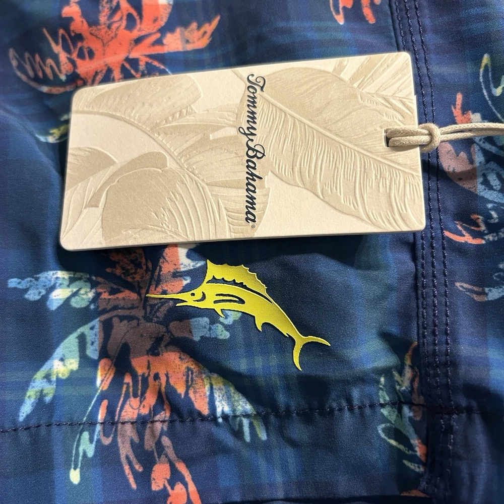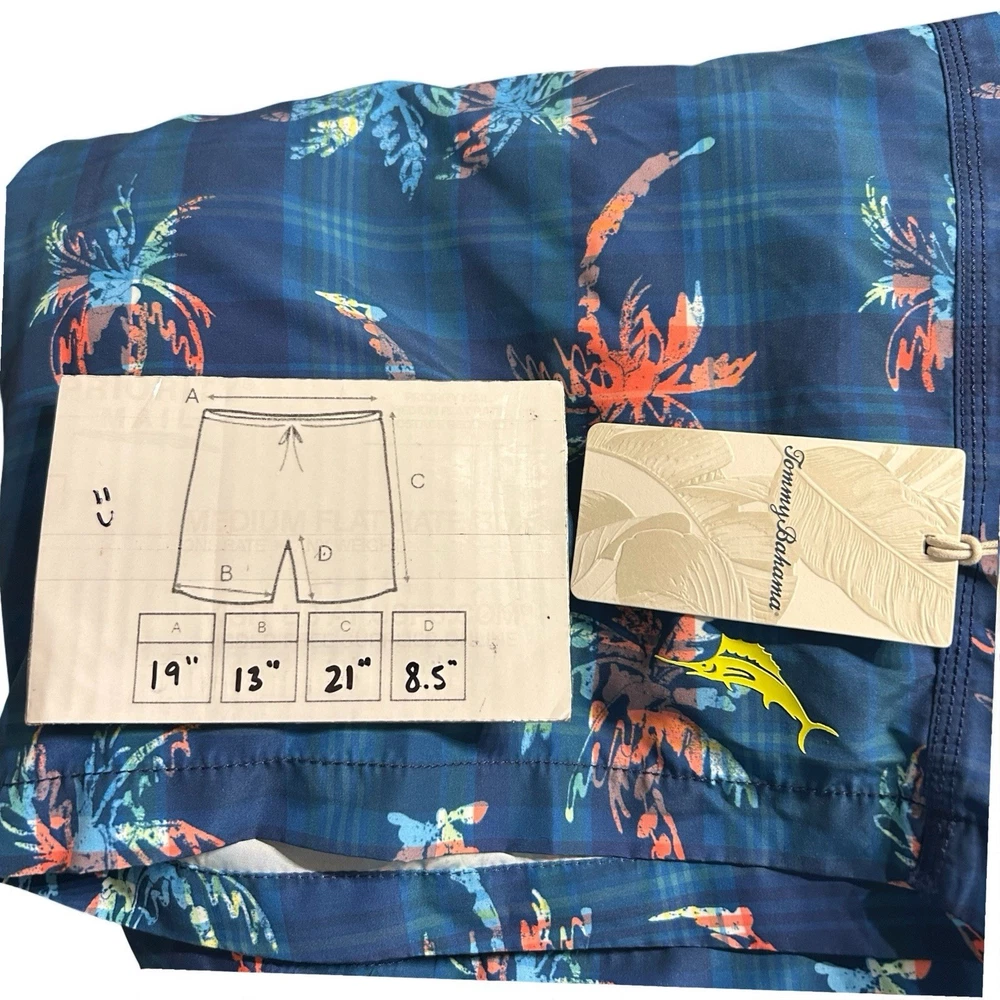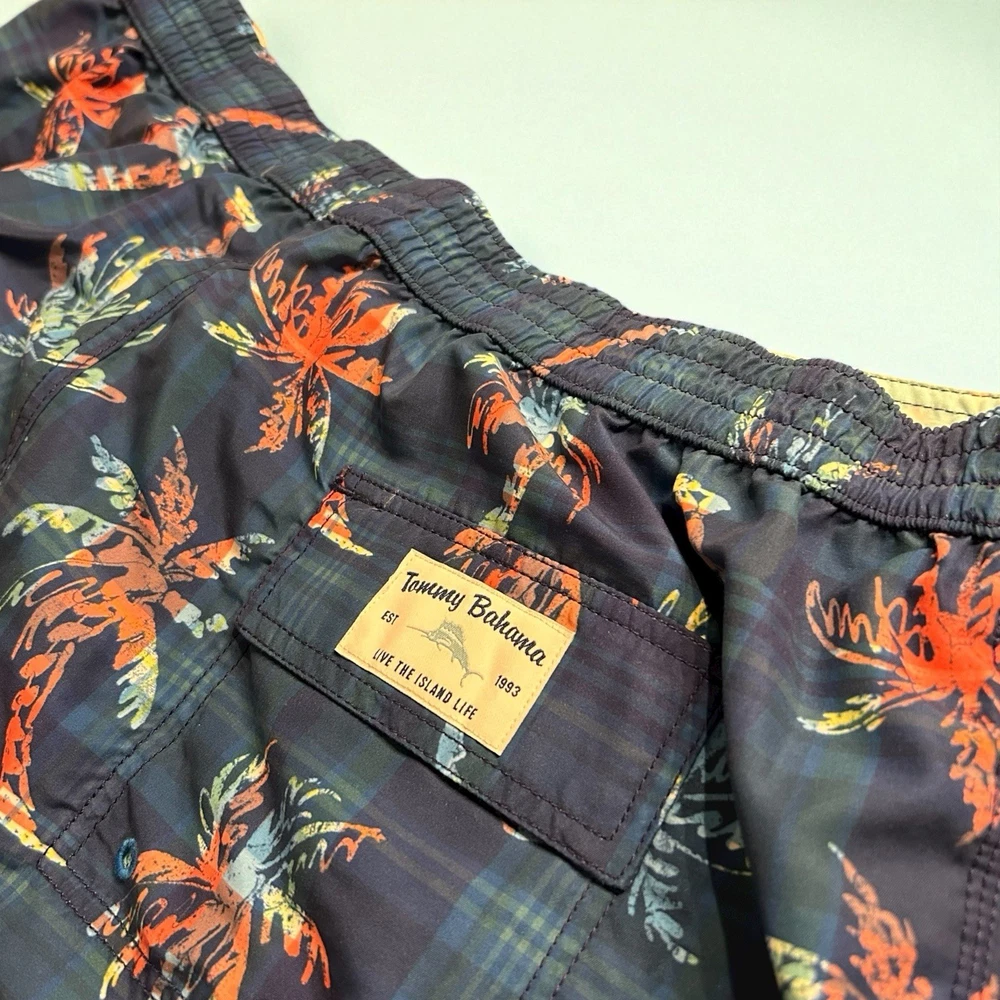 Brand new with tags, Tommy Bahama “Baja Palm Illusion” board shorts in Kingdom Blue feature a tropical palm print overlay on a tonal plaid base. Designed for style and performance with a zip fly + Velcro closure, adjustable drawstring, mesh liner, and side cargo pocket. Finished with the signature yellow marlin logo. Ideal for beach, pool, or resort wear. Details: • Brand: Tommy Bahama • Style: Baja Palm Illusion (TR918765) • Color: Kingdom Blue / Multicolor Palm Print • Size: Men’s XXL (2XL) • Material: Quick-dry polyester with mesh lining • Closure: Zip fly + Velcro tab with drawstring • MSRP: $89.50 • Features: Cargo pocket, embroidered marlin logo, elastic back waist • Made in China Measurements (approx): A: Waist (flat) – 19″ B: Inseam – 8.5″ C: Outseam – 21″ D: Leg Opening – 13″ Condition: Brand new with tags. No flaws. Ships within 48 business hours from a smoke-free home.