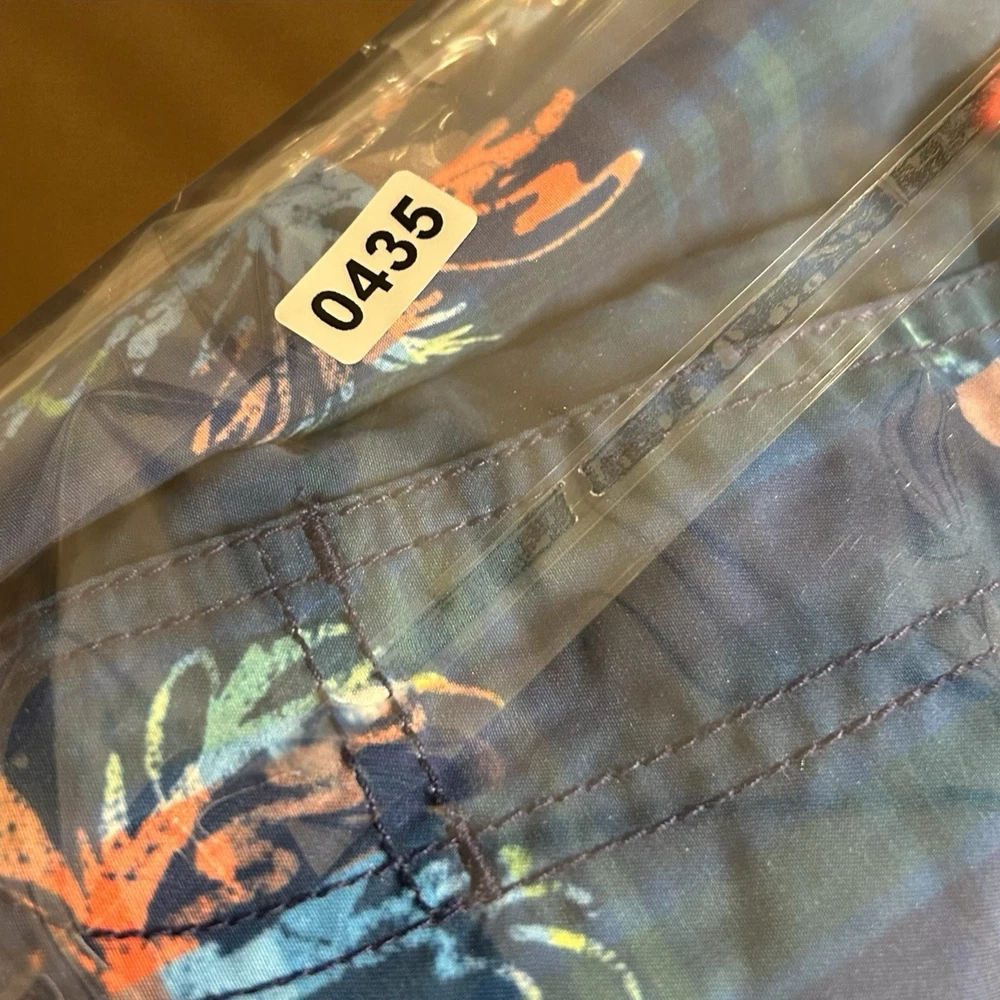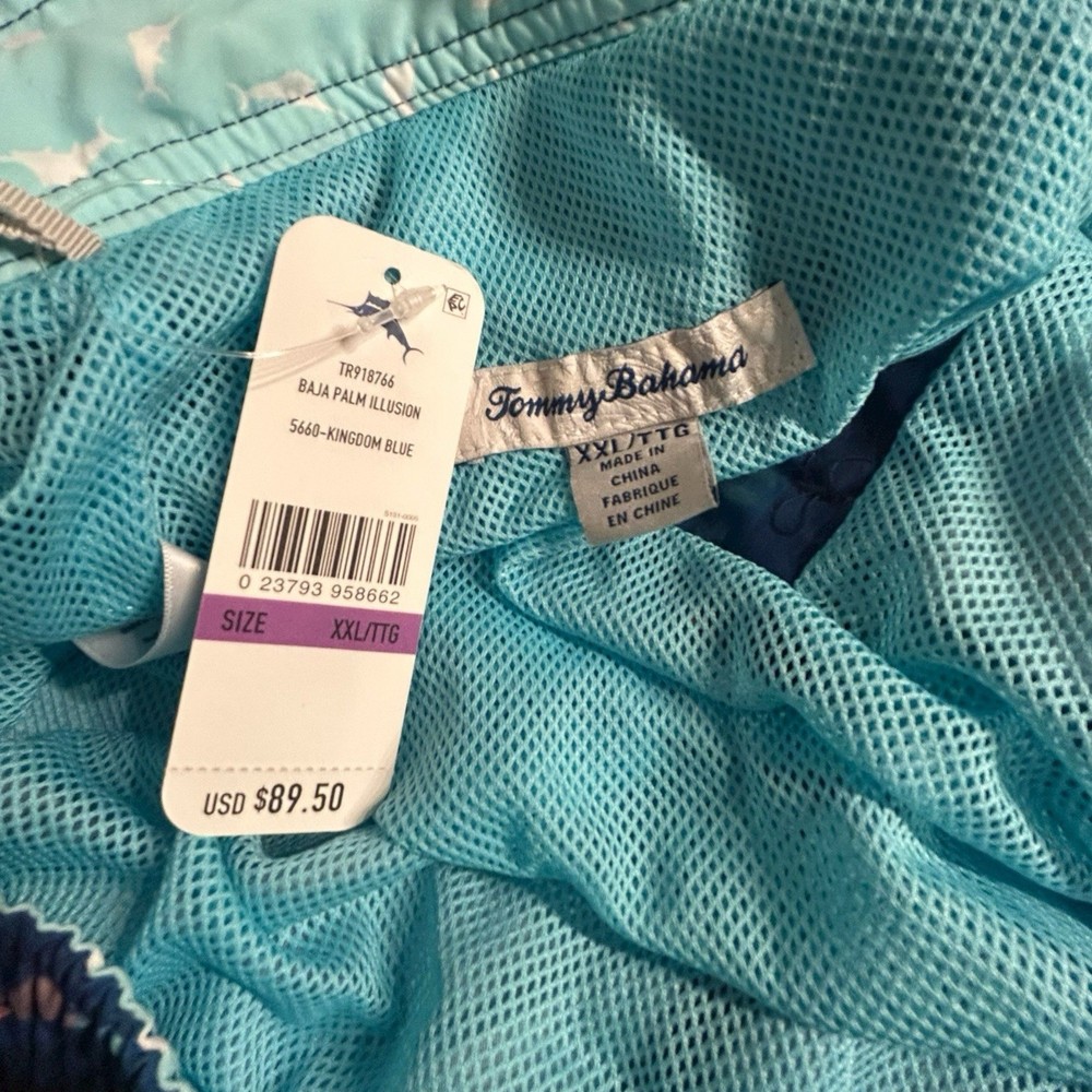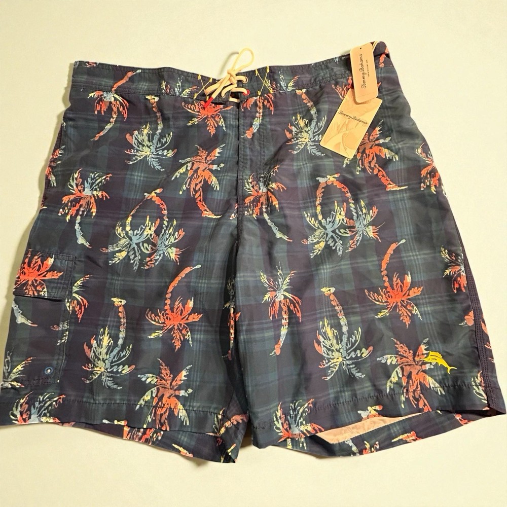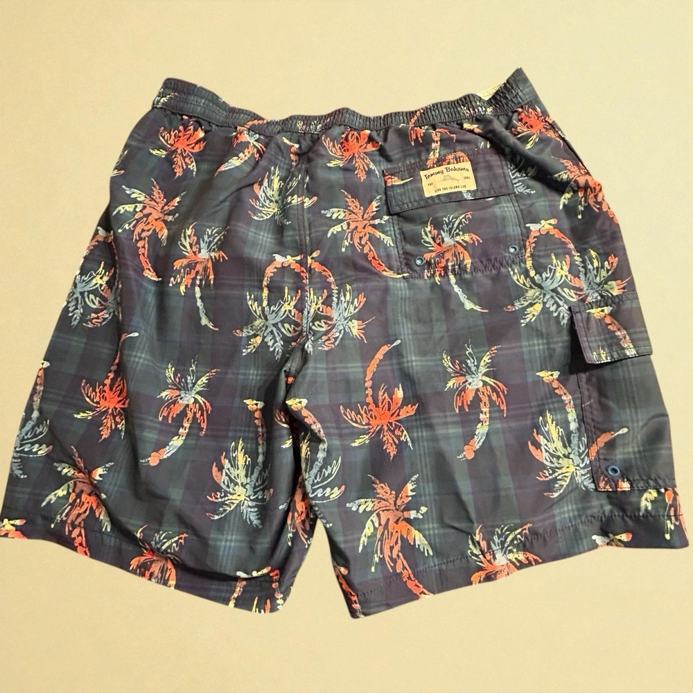 Brand new with tags, Tommy Bahama “Baja Palm Illusion” board shorts in Kingdom Blue feature a tropical palm print overlay on a tonal plaid base. Designed for style and performance with a zip fly + Velcro closure, adjustable drawstring, mesh liner, and side cargo pocket. Finished with the signature yellow marlin logo. Ideal for beach, pool, or resort wear. Details: • Brand: Tommy Bahama • Style: Baja Palm Illusion (TR918765) • Color: Kingdom Blue / Multicolor Palm Print • Size: Men’s XXL (2XL) • Material: Quick-dry polyester with mesh lining • Closure: Zip fly + Velcro tab with drawstring • MSRP: $89.50 • Features: Cargo pocket, embroidered marlin logo, elastic back waist • Made in China Measurements (approx): A: Waist (flat) – 19″ B: Inseam – 8.5″ C: Outseam – 21″ D: Leg Opening – 13″ Condition: Brand new with tags. No flaws. Ships within 48 business hours from a smoke-free home.