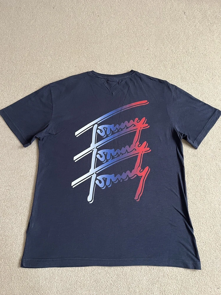 Men’s Tommy Hilfiger Navy Blue T-shirt With Back print - Size XL. Condition is Used. Dispatched with Royal Mail 2nd Class.