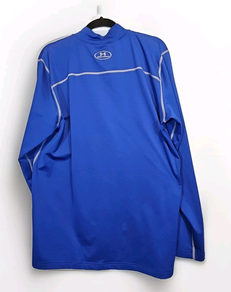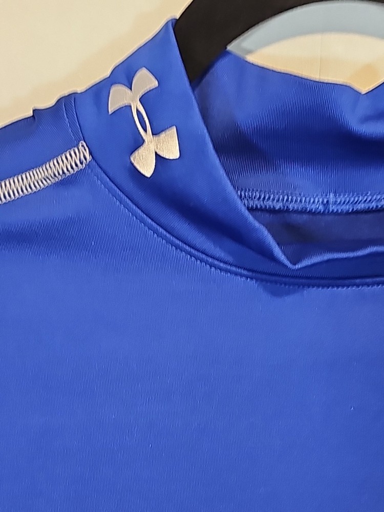 This is a men's Under Armour Cold Gear compression shirt in blue, size XL. It features a long sleeve design with a mock neck and a pullover closure. Made of a polyester blend fabric with a medium wash, this athletic-fit shirt is suitable for various activewear occasions like gym training, rugby, cycling, baseball, soccer, and football. The Under Armour ColdGear technology provides thermal insulation, making it ideal for staying warm during physical activities.