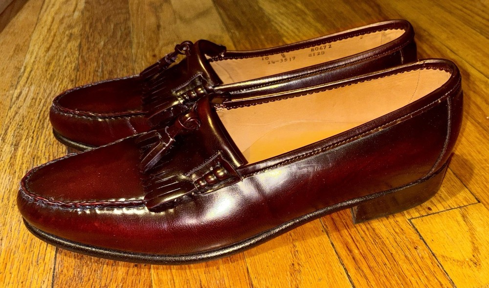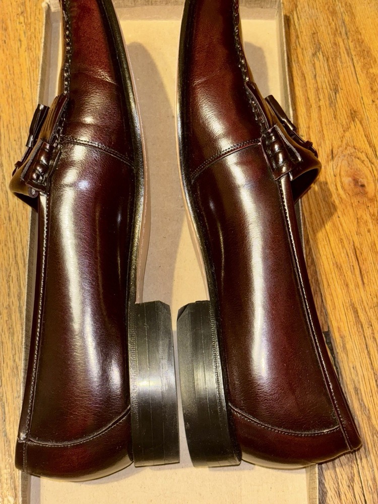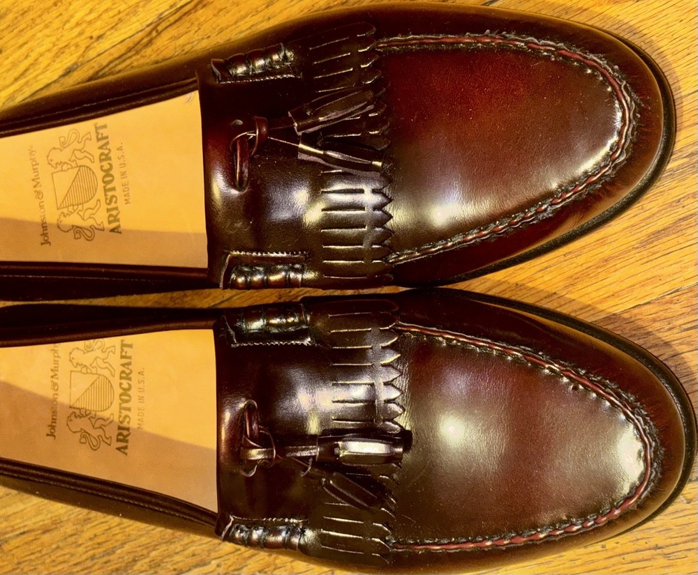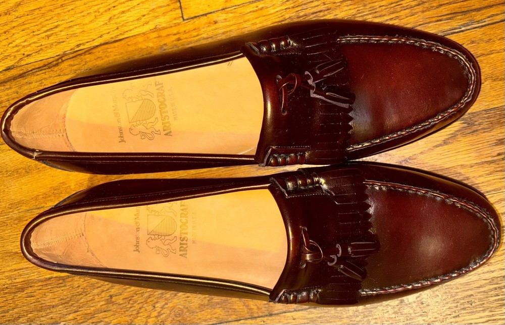 These are specifically the Johnston & Murphy "Crown Aristocraft" Shell Cordovan Tassel Loafers, known for their high-quality materials and classic. The Aristocraft line was Johnston & Murphy's top-tier boutique collection, with this particular model potentially dating back to the 1970s or 1980s, and the model itself having roots in the 1950s. These shoes are notable for their use of shell cordovan, a highly prized and durable leather, with Johnston & Murphy historically being a major customer of Horween for this material.