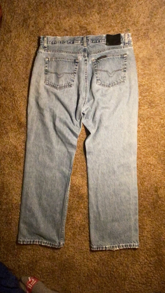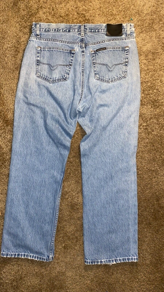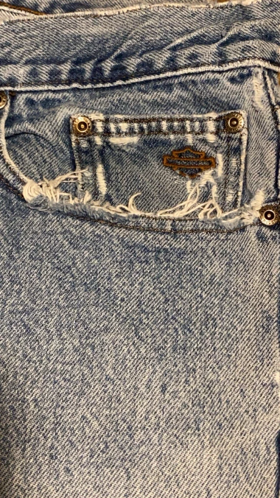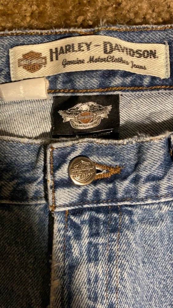 These jeans are very cool they do however have a few small holes as they are vintage and comes with it!! I have tried to photograph them the best I could, however the jeans are still structurally sound and have plenty of life in them! Step up your denim game with these vintage Y2K Harley-Davidson straight leg jeans. Made with high-quality cotton material, these blue jeans are perfect for any casual occasion. Featuring a zip closure and a 30-inch inseam, these jeans are a must-have for any Harley-Davidson fan. Not only are these jeans stylish, but they also come in a size 35x30, making them perfect for regular-sized men. The distressed detail adds a touch of edge to these classic jeans, making them a great addition to any wardrobe. Don't miss out on the opportunity to own a piece of Harley-Davidson history.