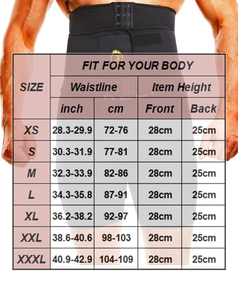 PRODUCT DESCRIPTION Condition: Brand New product. Material: 90%Neoprene + 10%nylon Sizes: S/M/L/XL/2XL/3XL Front height: 12.6in (32cm) Back height: 11.8in (30cm) Feature: Built-in 4 STEEL METAL BONES (Spiral Structure) to Support Back Suitable for sport, running, yoga, gym, workout, office, postpartum recovery Perfect for abdominal strains, muscle toning, power lifting, ab training, and tummy control. SIZE MEASUREMENT Please refer to our size chart before order, and Choose the right size below that fit you. NOTE: If your waistline is between two size, please choose a bigger one. Size S -------- Fits waistline 30.3"-31.9"inch Size M ------- Fits waistline 32.3"-33.9" inch Size L -------- Fits waistline 34.3"-35.8" inch Size XL ------ Fits waistline 36.2"-38.2" inch Size 2XL ----- Fits waistline 38.6"-40.6" inch Size 3XL ----- Fits waistline 40.9"-42.9" inch HOW TO WEAR Before begining to exercise, you can wear waist slimmer under clother or above vest, 3 rows hook allows you to adjust the level of compression, we suggest you have a slightly tighter position. Waist slimmer that can be worn during workout, better not more than 3-4 hours. ALLERGY NOTICE Some mens are allergic to NEOPRENE, if you with allergic constitution, we don’t recommend to wear waist trainer belt. If necessary, we strongly suggest you to wear waistband under a vest or sports T-shirt. First time to wear waist trainer belt, you maybe feel uncomfortable or tight, it is normal, our body need a process of adaptation, please do not worry. HOW TO WASH Dot not machine wash. It is better to wash in cold water, and the temperature should not exceed 30 degrees Celsius. DO not bleach, it will hurt waist trimmer. DO not Iron. ① Waist Trainer Belt Well Design ☛☛ Ultra-thin neoprene men weight trainer, made of 80%neoprene + 20% nylon. This sauna belts have special ANTI SLIP flex design, breathable material on the outer layer, sewn edge is reinforced with high elastic PP needle thread, ensure that the edges are not easy to fall off and have good flexibility. To make a comfortable experience in working out. ② Mens Waist Trimmer Sweat Cause ☛☛ Neoprene Material helping quickly you Sweat 3 Times more than Usual exercise (Sauna Effect), it can speed-up the calorie burning, keeping your muscles warm and back support. And waste trainers can be wear under clothing directly adjustable. ③ Waste Trainer WIth Belt Strap ☛☛ Design of strap with strong magic velcro, Controlled with double compression in 2 sides, tummy belt is naturally flexible adjustable freely, Sauna waist trainer protect the lower back muscles and abdomen from strain and fatigue. Power lifting, ab training, and tummy control. ④ Waist Slimmer Fits Variety Of Sports ☛☛ Stomach wrap, built-in 4 STEEL METAL BONES (Spiral Structure), mens workout corset waist training, provide strong support for back and correct your posture. It is suitable for sports, running, Yoga, weightlifting, gym, office. ⑤ Shopping Risk Free Notice ☛☛ Please read our waist belt size chart to measure waistline, Any question about our waist band, please contact us firstly by email and we will assist you within 12 hours. Exchange/Return/Refund is available, promise you satisfied. Hope you can be satisfied with our waist shaper.