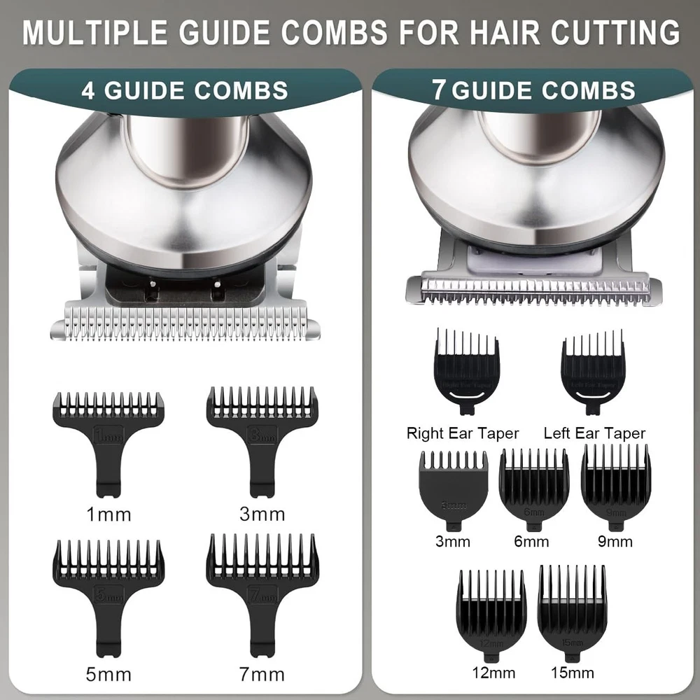 7 in 1 Beard Grooming Kit Fathers Gifts for Dad Multifunctional Shaving Kit For Head To Toe Use - This is a high quality all in one machine that includes 7 trimmer heads, 12 guide combs,a hair comb, a travelling bag,a hair-cutting cape, Covers all hair cutting tasks, from hair, face, beard, nose, ear, body, pubic area. This is professional men's grooming kit and gifts for him. 5 Stars Performance - With a motor that speeds up to 6500RPM, the beard kit delivers a quiet and efficient shaving experience. Easy to clean the blade by rinsing under water.(Note: please don't immerse the whole trimmer in water) Long Battery Life with LED Display - Our rechargeable manscape trimmer equipped with a powerful Lithium-ion battery. With just 1.5 hours of charging time, you'll get 180 minutes of use! Humanized LED display design shows remaining power and reminds you to charge in time. Multiple Guide Combs For Hair Cutting - This trimmer kit includes a T-blade trimmer equipped with 4 guide combs(1mm,3mm,5mm,7mm), a hair clipper equipped with 5 guide combs(3mm,6mm,9mm,12mm,15mm) , which can satisfy all your grooming needs according to your hair length.The beard trimmer is equipped with 1 adjustable positioning comb for 1/2/3/4/5/6/7/8/9/10mm, which is suitable for trimming and styling beard/sideburns. And body hair trimmer head is equipped with 3/6/9mm comb for trimming hair on various parts of your body Prime Gifts for Men With One Year Warranty - Surprise your husband or any special man in your life with the perfect gift for his birthday, Father's Day, Christmas, or Valentine's Day. If you encounter any problems, don't hesitate to contact us. We offer a one-year warranty and are dedicated to providing a satisfactory solution for all our customers.