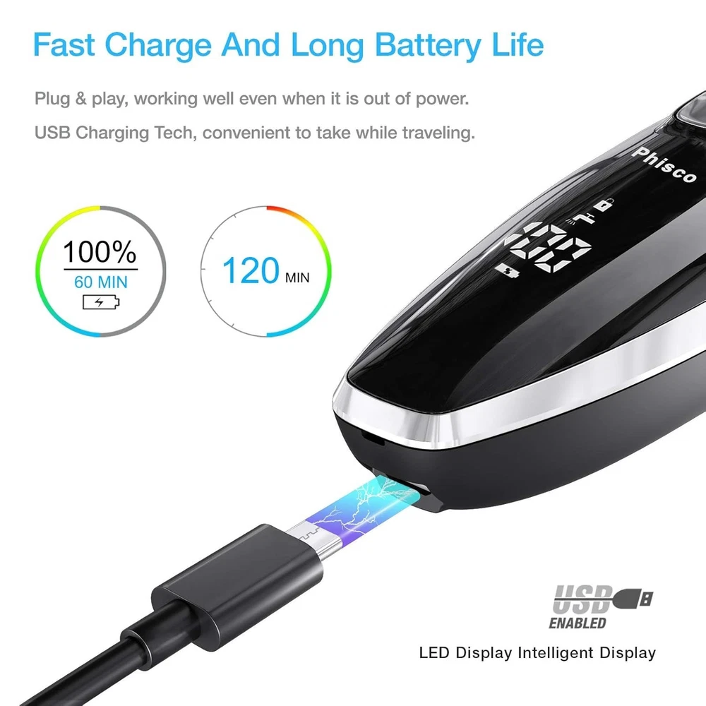 Color: Black Department: Men Motor Type: Rotary Number of Heads: 4 Type: Multi-Function Shaver UPC: Does Not Apply Recommended Uses For Product: Beard, Mustache, Face Body Area: Face, Beard, Mustache, Body, Neck, Back, Chest, Ear, Nose, Pubic gtin13: Does Not Apply Power Source: Cordless Electric Product Dimensions: 6.1 X 2.3 X 2.5 Inches; 14.4 Ounces Head Type: 4 Head Rotary Brand: Unbranded Features: Cordless, Fast Charging, Wet/Dry, Pop-up Trimmer, LED Display, Self-sharpening Steel Blades, High Efficiency, Waterproof, Anti-scratch Item Weight: 14.4 ounces Batteries: 1 Aa Batteries Required.