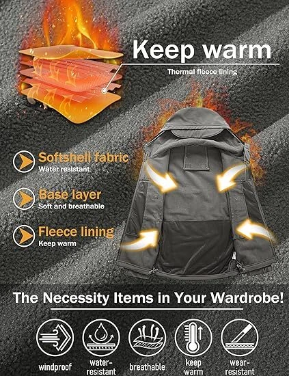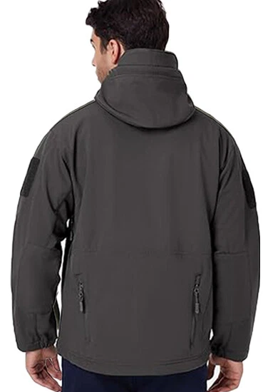 Product Description Classic tactical jacket, comfortable for all outdoor activities. it can keep you dry in the small rain and snow, also block all wind and keep the cold air out. Flexible & Multi-function. 100% polyester soft shell fabric, with thermal fleece liner, keep you pretty warm in winter. Waterproof & Windproof; Men's Clothes Zipper; Huge hood can be roll up; Two way zip up to open or close; Under arm vent zippers; Hook & loop adjustable wrist cuff; Drawstring waist and hood; Large loop on both arm for individuality patches. Tactical multi-Pockets design: 2 large zippered chest pockets; 2 back pockets; 2 small pockets on left arm and 1 small pockets on left sleeve. Good for winter, autumn and spring. Great for outdoor sport, hunting, fishing, hiking, climbing, camping, travelling, motorcycle, cycling, work and casual wear. Model Show Applicable scene