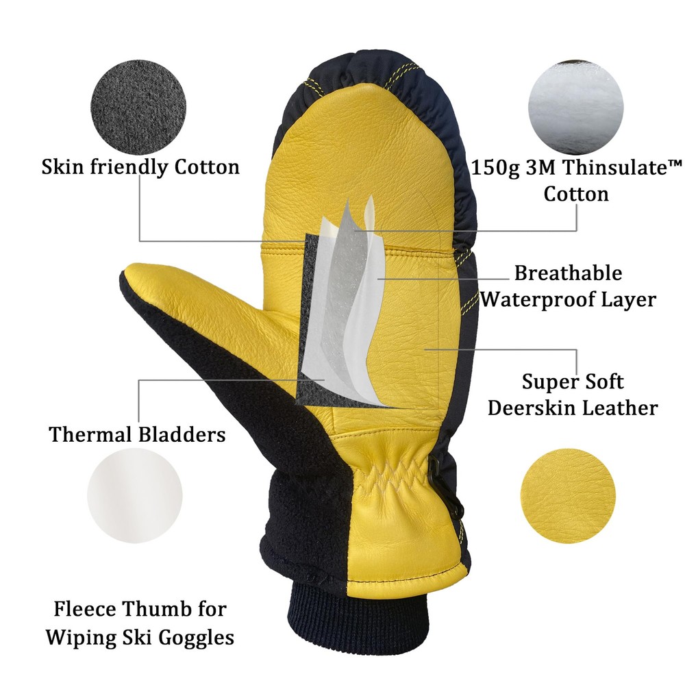 [ Genuine Deerskin Leather Palm ] - Super softs, safe and protected! It absorbs impact and vibration. Premium Genuine Deerskin Leather is naturally soft and flexible, with good abrasion resistance. Compared to other similar items in the market, this ski glove is more wearable, more comfortable, warmer and more reliable [ Warm Insulation and Thermal Jersey Socked Lining ] - 150g 3M Thinsulate Insulation is warm yet lightweight, powerful yet thin. It helps trap hands heat while allowing moisture to escape. Protect your hands while you're out Skiing in cold temperatures [ Multiple Thermal Materials ] - From the back of the gloves to the inside of the gloves, there are multiple layers for thermal preservation: Deerskin Leather → Thermal Bladders → 3M Thinsulate Insulation → Breathable Windproof Layer → Skin-friendly Thermal Jersey Socked Lining [ Super Warm Design Function ] - Thermal and Windproof Bladder Inside Design is perfect for the winter snow sport and cold weather work. Suitable for snowboarding, Cross-Country skiing, snowmobile, ice fishing, shoveling snow, hiking, and other winter outdoor activities [ Size and Fitting ] - Double shirred elastic wrist designed to fit most of the hands, and the Deerskin is also had a good stretch [The Best Flexibility in Winter] - This gloves adopt human palm engineering technology provide Superior fitting, stretchy and not bulky