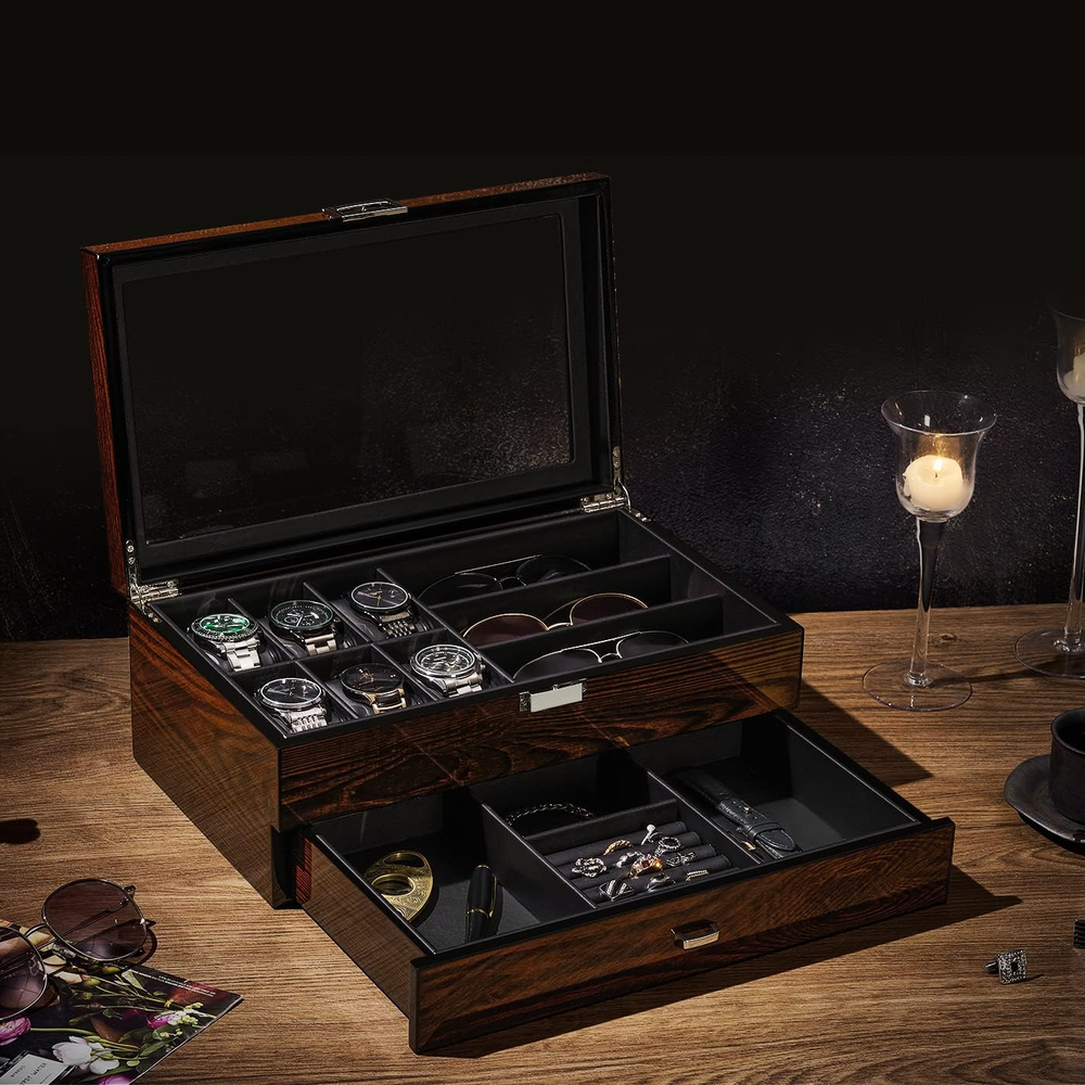 Store New Arrivals Add to Favorite View Feedback Contact Watch Box Watch Case Wood Mens Jewelry Box with Valet Drawer Watch Organizer Display Case with Large Glass Lid for Sunglasses Watch Storage, Smooth Faux Leather Interior, Brown SSH32Y Description Item model number SSH32Y Style Modern Number of Items 1 Country of Origin China Warranty Type No Warranty Batteries Included? No Jewelry Storage Type Jewelry Case Batteries Required? No Number of Compartments 9 Special Feature Lock Product Dimensions 8.66"D x 14.2"W x 5.67"H Material Engineered Wood Number of Drawers 1 Finish Type Polished Closure Type Drawstring Item Weight 7.87 pounds Finish Polished Occasion Christmas, New Year, Friendship Day, Birthday Special Features Lock Target Audience Men Part Number SSH32Y Mounting Type Table Top Color Brown Inner Material Faux Leather Shape Rectangular Recommended Uses For Product Watch Included Components 6 watch case with jewelry drawer TOP-NOTCH CRAFT: The watch organizer is made of MDF, Interior is covered with smooth faux leather, watch pillow with PS material and sponge cushions, highlight unique beauty while protect watches and sunglasses from scratching. Perfect for personal or business use and great for shop window watch displaying ORGANIZE YOUR WATCHES AND SUNGLASSES: The first layer offers 6 watch slots and 3 glasses or sunglasses compartments, and the watch holders can be removed if you need upper tier space for other items. The bottom drawer provides additional storage for extra bands, rings, bracelets, tie clips, cuff links and other jewelry accessories NO LONGER CLUTTERED: Nothing more frustrated than having all watches and sunglasses around drawer and room. This sunglass and watch organizer creates a single location for your loved watches and sunglasses ,you don't have to spend time to search for a suitable accessories in the morning and can easily decide which one to wear before going out LARGE REAL GLASS LID: This sunglasses case has a clear top, you will own a broad vision to find your most favorable treasure in seconds, while keeping the watches and sunglasses from getting dust. If your watch is Eco drive! Light can pass through the top of the glass to charge the watch WONDERFUL GIFT FOR ANYONE: Are you still searching for a perfect gift from all kinds of things for him? This watch box organizer with an high end gift box is a great personalized ideal for father, mother, husband, son, colleague, friend in your life ,on Father's day, Valentine's day , Anniversary day ,Birthday ,graduation, etc Product Description Beautiful Way To Organize Your Watches and Glasses With this BEWISHOME sunglass and watch jewelry organizer , you can keep all your watches and glasses in one place, instead of leaving them on your desk and in drawers High Quality Pillows and Smooth Faux Leather Interior The inside compartment is covered in smooth faux leather to protect your sunglasses. With the clear glass top, you can view your items without them being touched, no dust, dirt or fingerprints. Fit For Various Watch Styles And Size The flexible squares are large enough to fit men's giant wrists, but also pliable enough to accommodate women's daintier jewelry if need be. Elegant Gift Box The watch Jewelry box is a wonderful gift for your special someone. Whether for your husband, father, friend, or for watch enthusiast on Christmas, Birthday and Valentine’s Day,it even can delight the most hard-to-please recipient Large Storage Inside - Material: Medium Density Fiberboard (MDF), Faux Leather Liner - Window: Real Glass - Color: Rust Brown Watch Box, Black Pillows - Product Dimensions (Lx W x H): 14.2" x 8.66" x 5.67"(36x 22 x 14.4cm) - Watch Slot Size: 1.9" x 3.74"(4.8 x 9.5cm) - Size of Glasses Case: 7.01" x 2.56"(17.8 x 6.5cm) - Net Weight: 8.8 lbs Package Contents: - 1 x Jewelry Box - 6 x Removable Pillows ABOUT US We offer the best prices around on high quality products. Our E-store includes media such as books, movies, music and games while offering electronics, toys, sporting apparel, clothing, tools, general home, garden items and more. SHIPPING We are always working hard to ensure your package arrives as soon as possible. Please understand that some factors like weather, high postal traffic, and the performance of shipping companies are outside of our control. We offer free shipping to the lower 48 states and ship within 2 business days of payment, usually sooner. We do not accept P.O. Boxes. Please provide a physical address. For shipping outside of the continental USA, we only use eBay's Global Shipping Program.The item is shipped to KY and then sent to the rest of the world. International customers are responsible for all duties and taxes. Continue to check out in order to calculate costs for shipping the item to your country. Messages regarding eBay's Global Shipping Program MUST be directed at eBay EXCLUSIVELY. RETURNS We offer a 30-Day Return Policy on items which you are not completely satisfied with. You have the option for a full-refund or an exchange of the item. No returns are available on items shipped outside of the USA. PAYMENT We accept PayPal. CONTACT US This page content is yet to come Please ad us to your favorite seller and visit again later Thank You CUSTOMER SATISFACTION We try our very best to make sure every customer is completely satisfied. If there's a problem, message us! We're happy to help. WE ACCEPT Copyright © 2021 AutoDS. | All Rights Reserved
