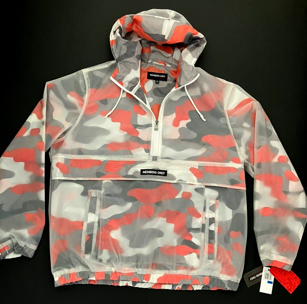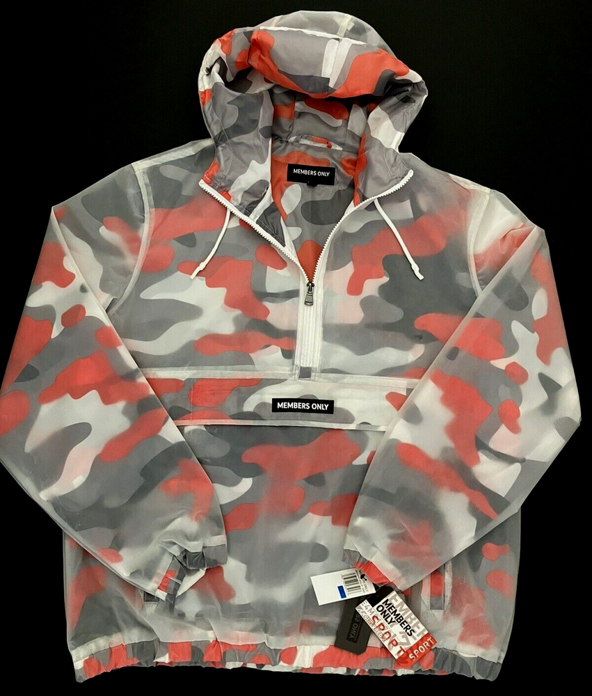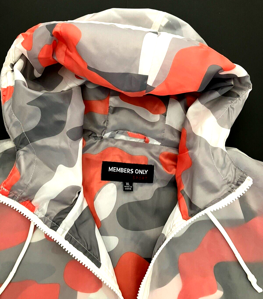 Members Only Orange & Black Camo Hooded Lined Waterproof Rain Jacket Men's XL STRIKING, UNIQUE, EYE-CATCHING, URBAN COOL - Waterproof Polyurethane (rubbery) translucent, see-through shell with a SHARP, COLORFUL camo print Polyester lining in bold orange, white, black, & tan. Excellent weather protection with lightweight comfort & medium warmth - also perfect for layering in colder temps. Ideal for activewear, boating, skiing, snowboarding, traveling, cruise ship wear, urban streetwear, etc. Details & Features: - Brand: Members Only - Style #: MM020018C - Condition: NEW WITH TAGS - Style: Pullover anorak, popover hooded jacket - Color: Orange, black, white & tan camo - Size: Men's XL, Chest 54" - 56" - Fit: Roomy, relaxed, ideal for layering for colder temps - Shell: Translucent, see-through, rubbery Polyurethane - Lining: Polyester - Fully lined with a soft, smooth lightweight Polyester fabric - Oversize hood, full lined, with drawcord - Durable, rip-free metal eyelets secure the drawcord - Elastic banded sleeve cuffs & waistband - Side slant open hand pockets - Heavy duty zipper that extends 1/2 way for easy on/off - A HUGE pouch pocket with a storm flap for great security for valuables & protection against the elements - Locker, hanging loop inside the back of the neck - PROMINENT, BOLD, SIGNATURE "MEMBERS ONLY" branding logo across the front - Embossed branded, heavy duty metal zipper & hardware - Wash with clean damp cloth Returns: We want you to be completely confident & satisfied with your purchase & shopping experience with us. We know how important the right fit is. If for any reason you are not satisfied with this jacket , we will accept a return as long as the jacket is returned to us unworn by you, & in the brand new , all tags attached condition, in which we shipped it to you in. You will have to pay for the return shipping, & after we receive the jacket & confirm its new condition with all tags attached, we will issue you a refund. Thank you very much, we greatly appreciate all of our customers. All Fur Love, TN, Private Forever Home Dog Rescue SHIPPING: - FAST shipping within 24 to 48 hours of payment - We will gladly bundle items in our store to save on shipping for you - just send us a message please Thank you for visiting our store. WE WISH YOU A HEALTHY & HAPPY DAY :) ** We urge you to contact us with any questions, concerns, etc. We conscientiously strive to impart OUTSTANDING customer service and high quality merchandise. We are (young) senior resellers who support our private dog rescue, "ALL FUR LOVE, TN". Your purchase and satisfaction allow us to continue to provide a FOREVER, loving, safe home for many wonderful, needy souls. THANK YOU **
