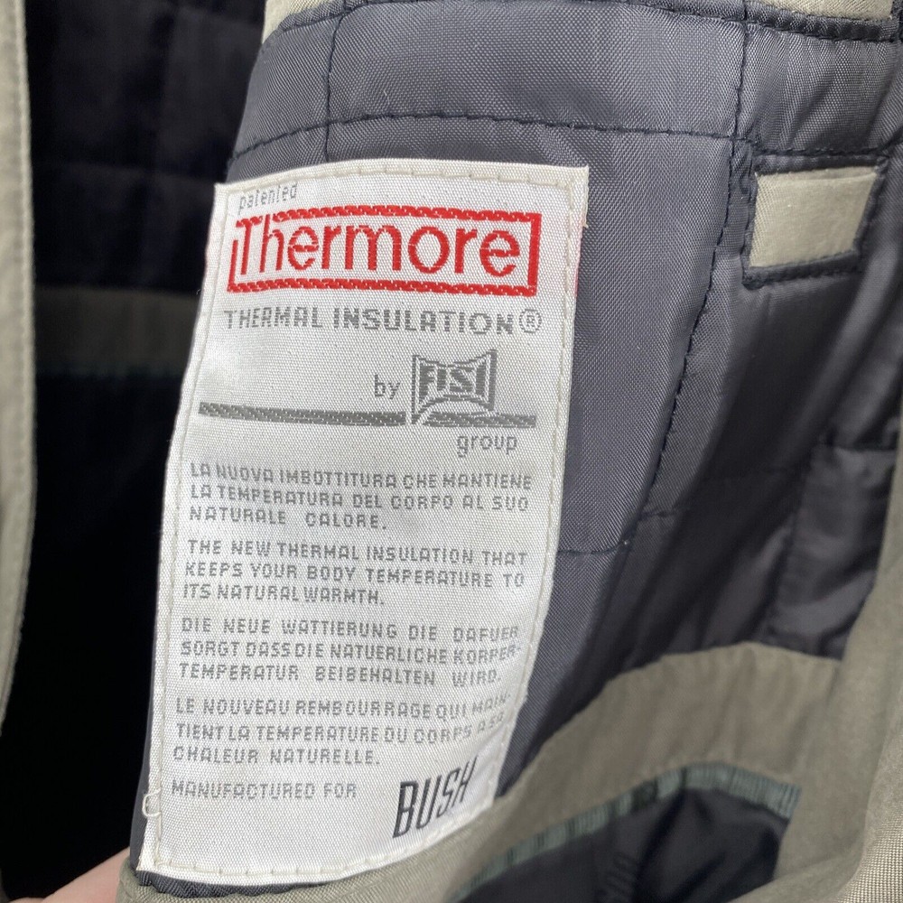 Bush Men's Coat XL Thermore Thermal Insulation Full Zip Khaki Tan SEE ALL MEASUREMENTS TO ENSURE BEST FIT. Very good condition, see all pictures for views. Very nice feeling coat! More lightweight but still warm. Color is a khaki greenish tan. Pit to pit: 27" Shoulder to hem: 34" Ships out same day or next open postal day. Thank you for your purchase, we appreciate you!