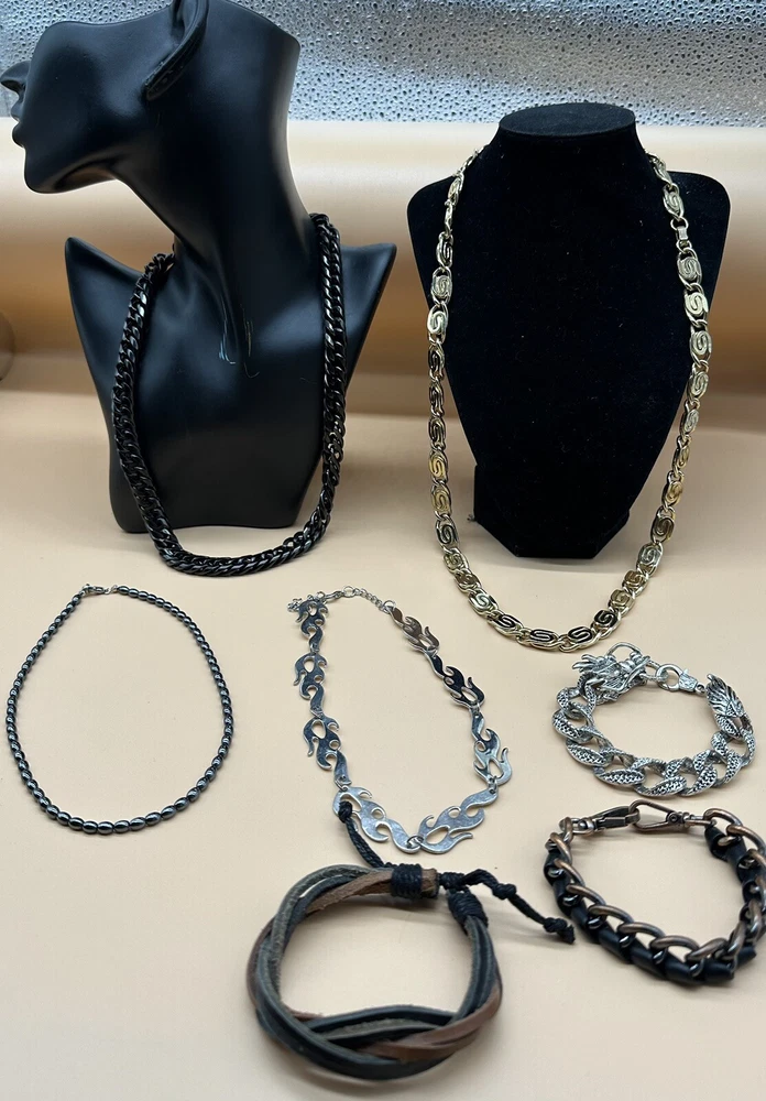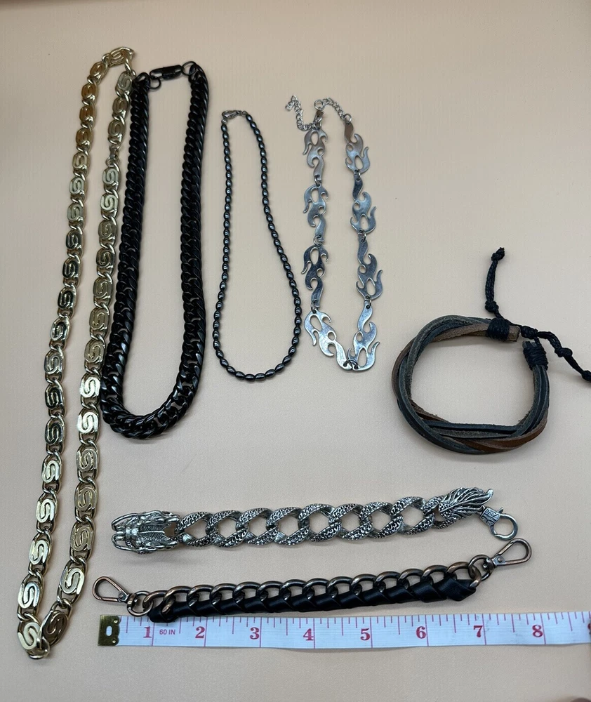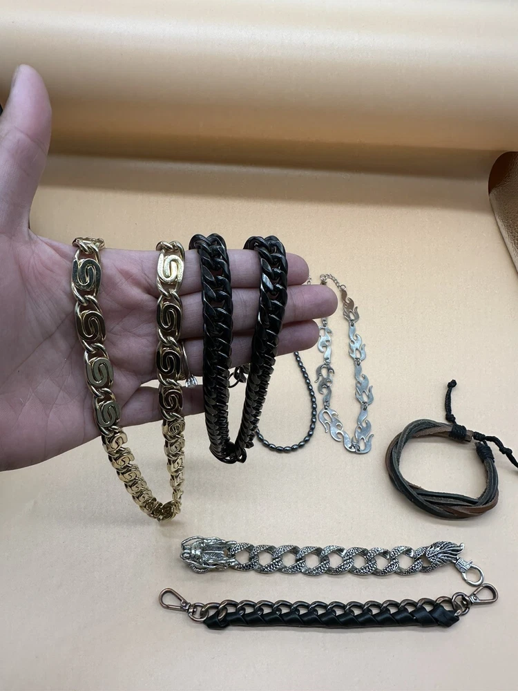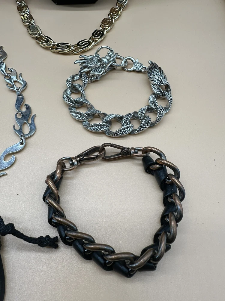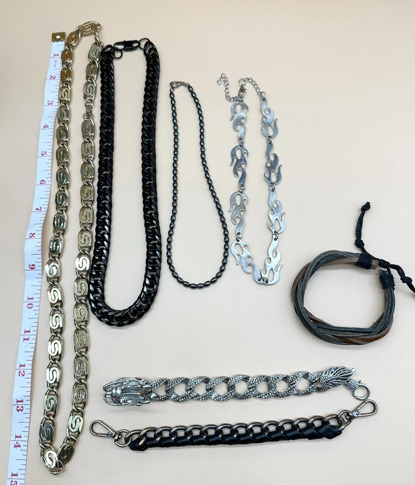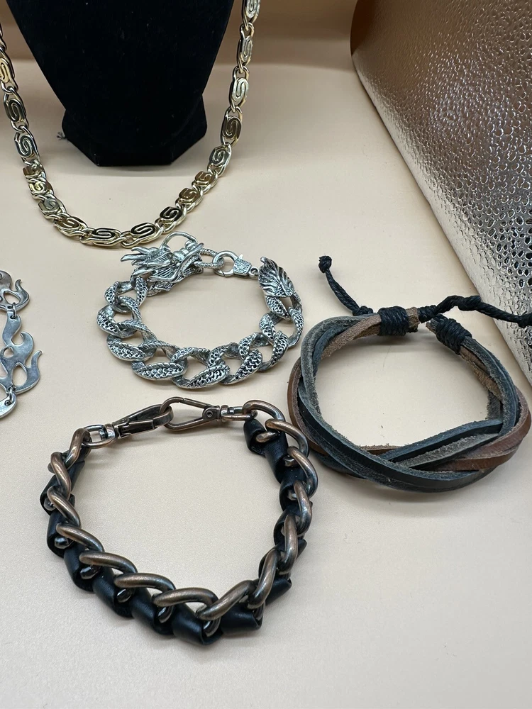 Add a touch of style to any outfit with this fashion jewelry lot for men. The set includes a necklace and bracelet, both featuring a sleek chain design with a statement choker. The leather material adds a touch of sophistication, while the silver, gold, and black color options make it versatile for any occasion. The metal and stainless steel materials ensure durability and longevity. Perfect for the fashion-forward man who wants to make a statement.