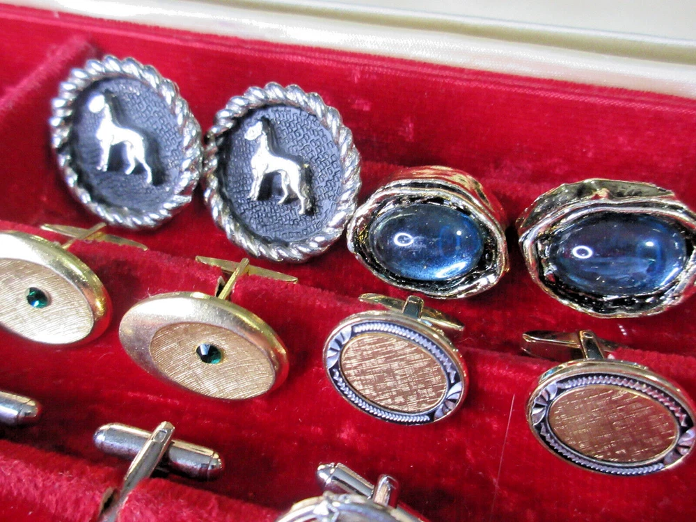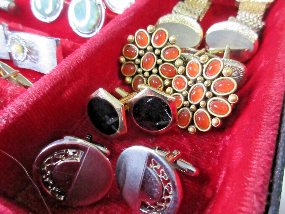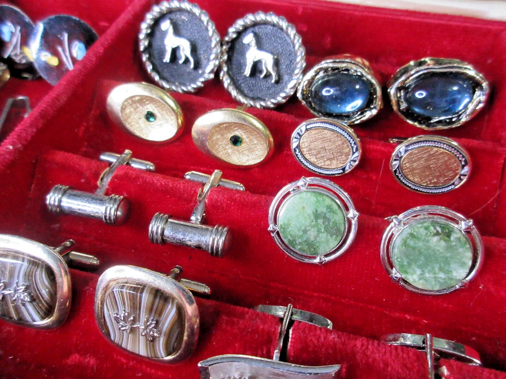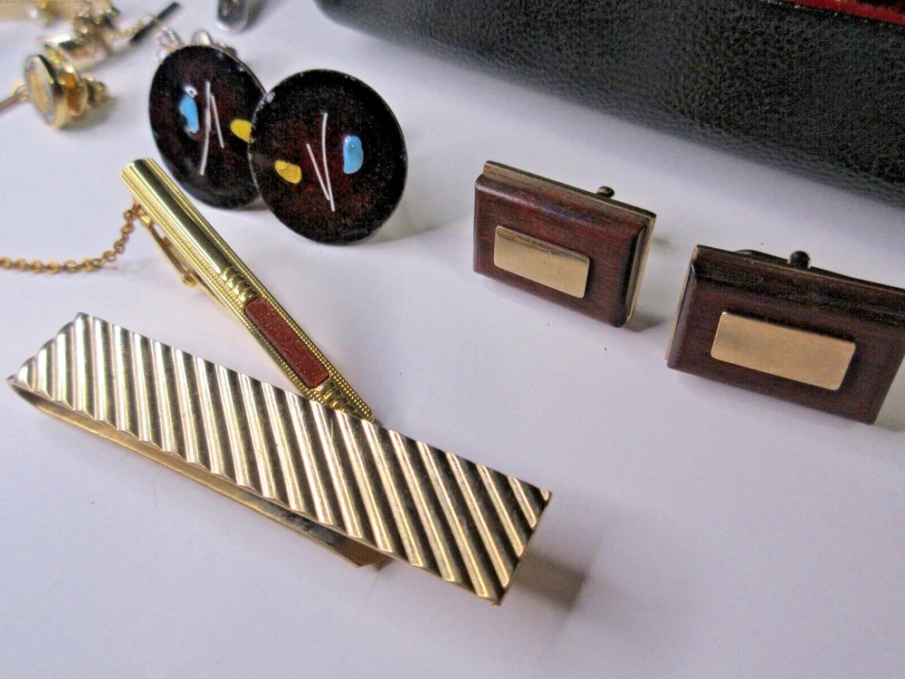 This is a wonderful lot of vintage men's accessories in a vintage Allen brand valet. The lot consists of: 18 pair cufflinks 4 tie bars 3 tie tacs All items will be individually bagged and securely shipped