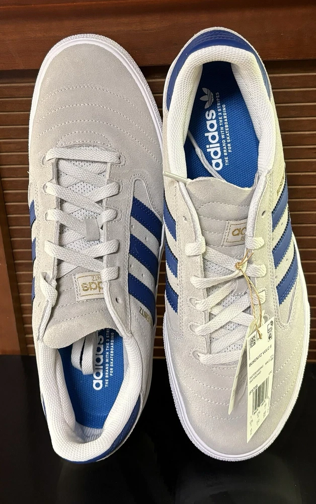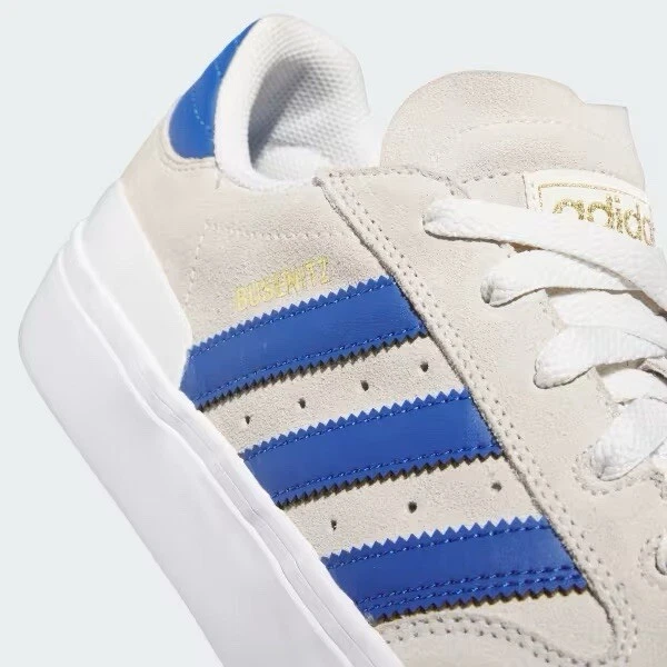 A revamped version of Dennis Busenitz's signature adidas shoe. The best just got better. This redesign of legendary skater Dennis Busenitz's signature shoes one-ups the original with even more cushioning and durability. Should you need to suddenly pump the foot brakes, an abrasion-resistant toe box has your back. Regular fit Lace closure Suede upper Geofit padded collar Vulcanized suede skate shoes Stabilizing heel counter Vulcanized rubber outsole Imported Product color: Crystal White / Royal Blue / Gold Metallic Product code: IF9708