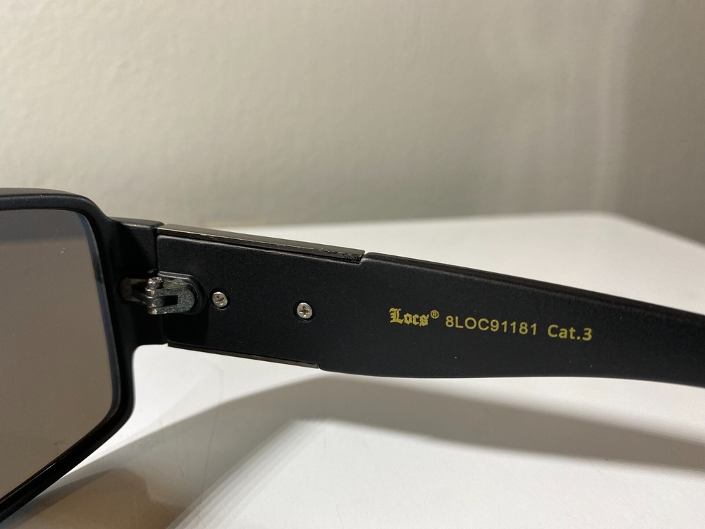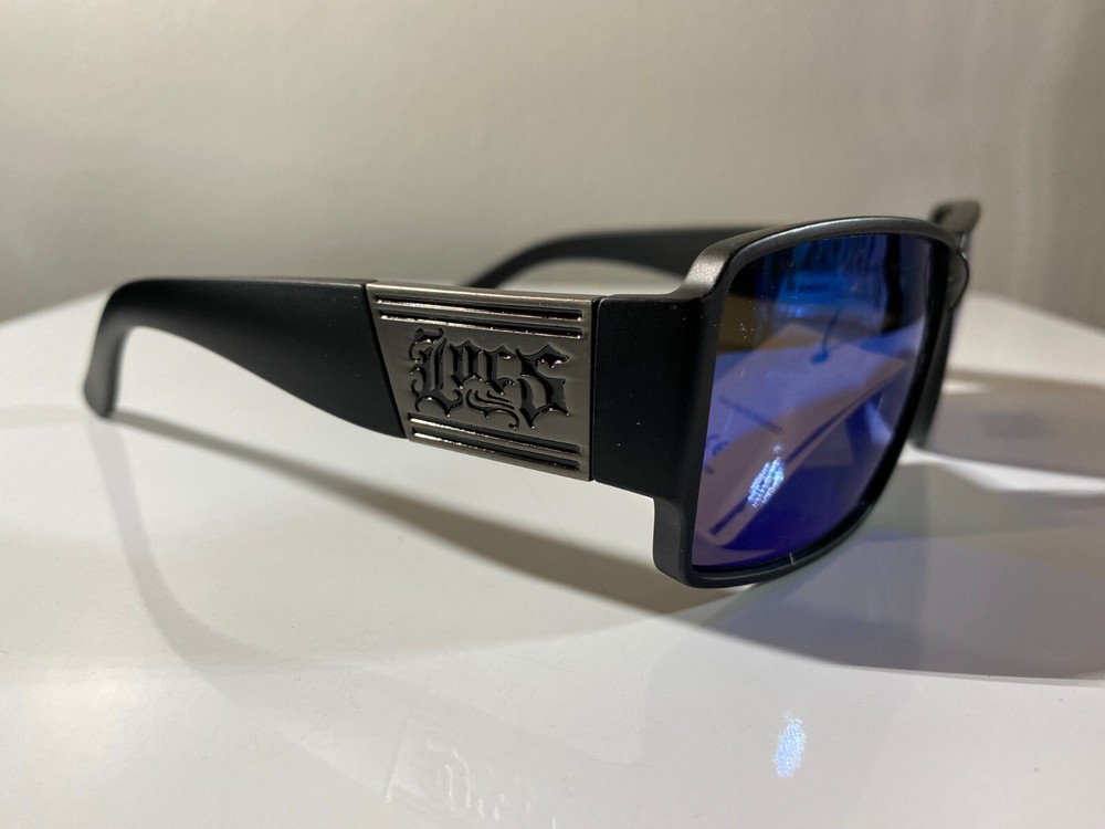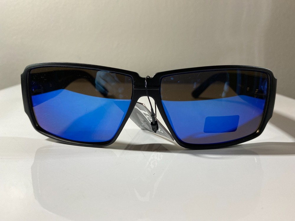 Men's designer sunglasses with black frame and blue reflective lenses. Great price.