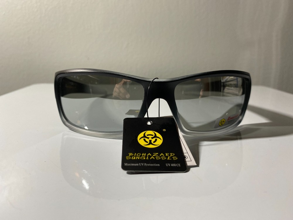 Biohazard brand, men's riding style sunglasses with black frame and smoke gray lenses. Also ideal for workplace safety glasses where side shields are required.