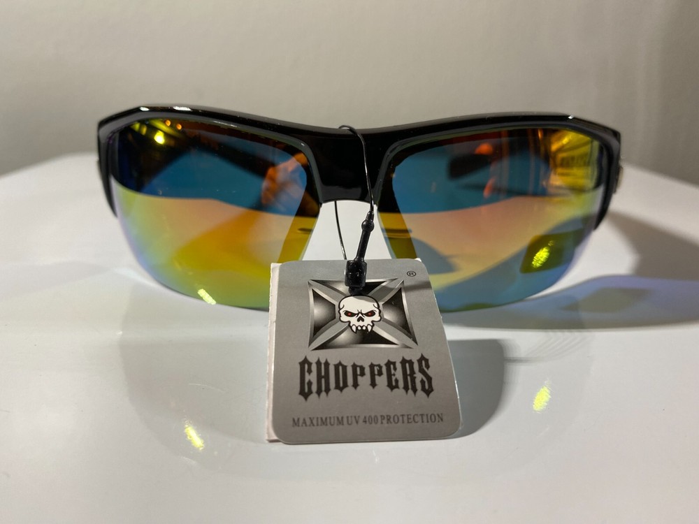 Men's popular riding sunglasses with black frame and yellow reflective lenses. Great price.