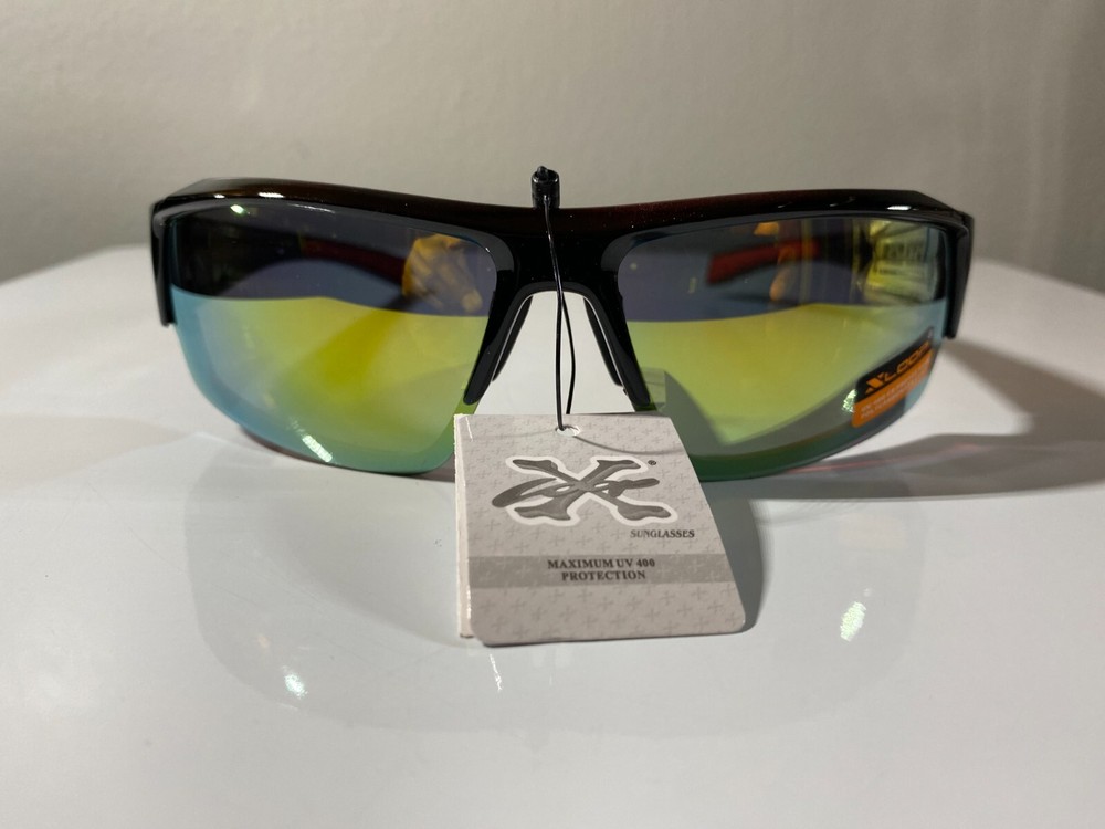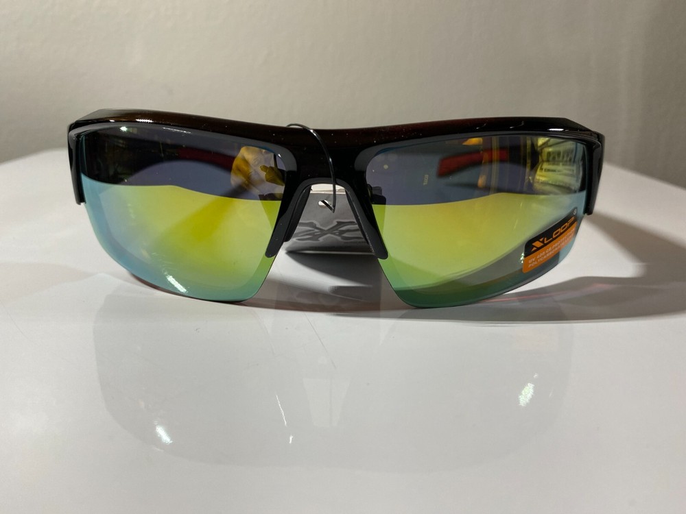 Men's wrap around sunglasses with black frame and yellow reflective lenses. Great price.