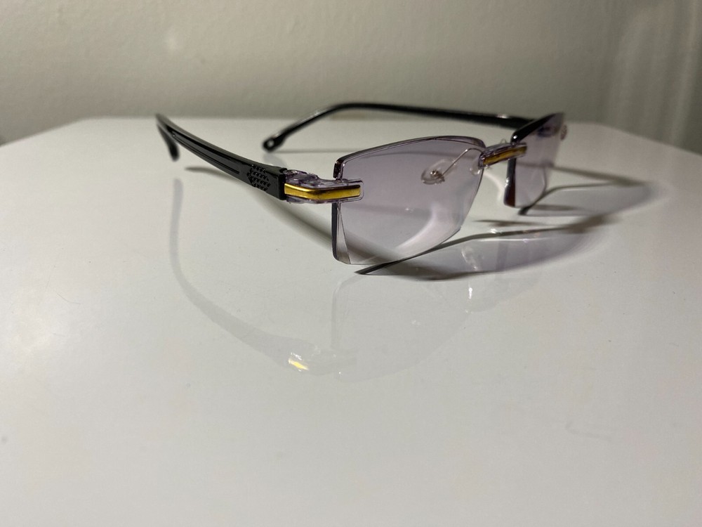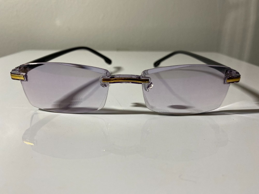 Simple version of classic urban style eyeglasses with black frame and lightly tinted lenses.