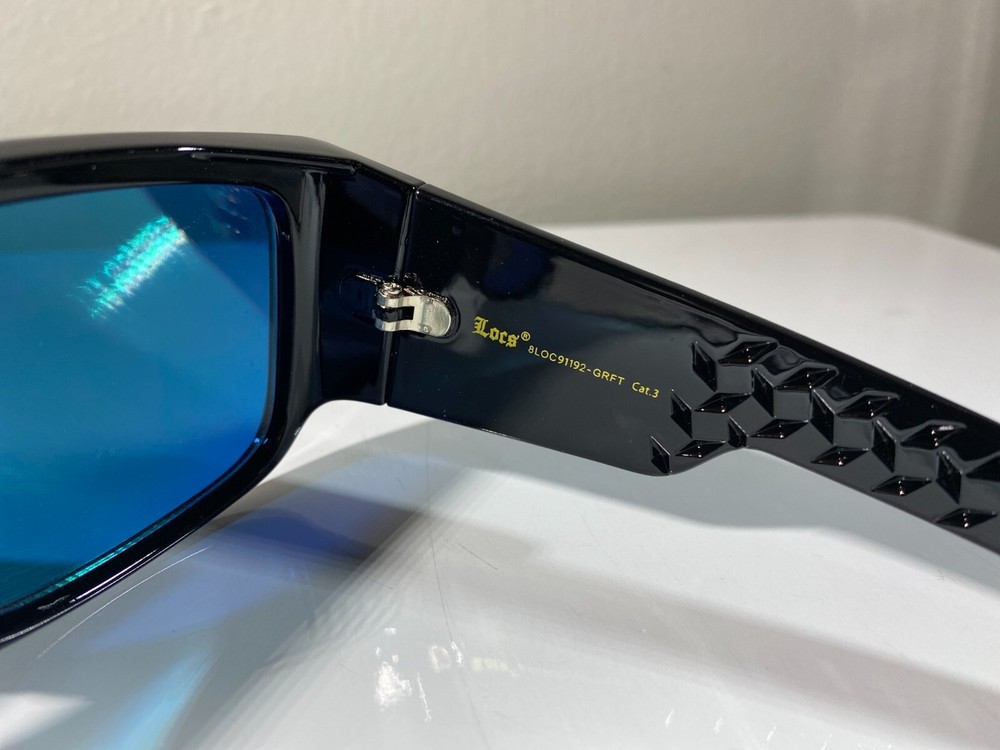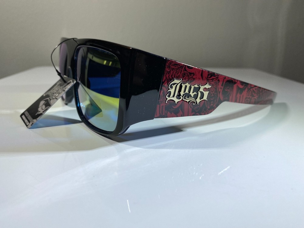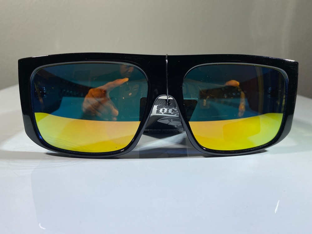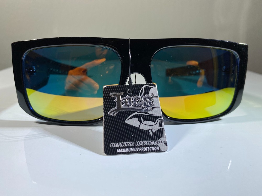 Men's sunglasses with reflective yellow lenses and red and black graffiti side arms. Great style at great price.