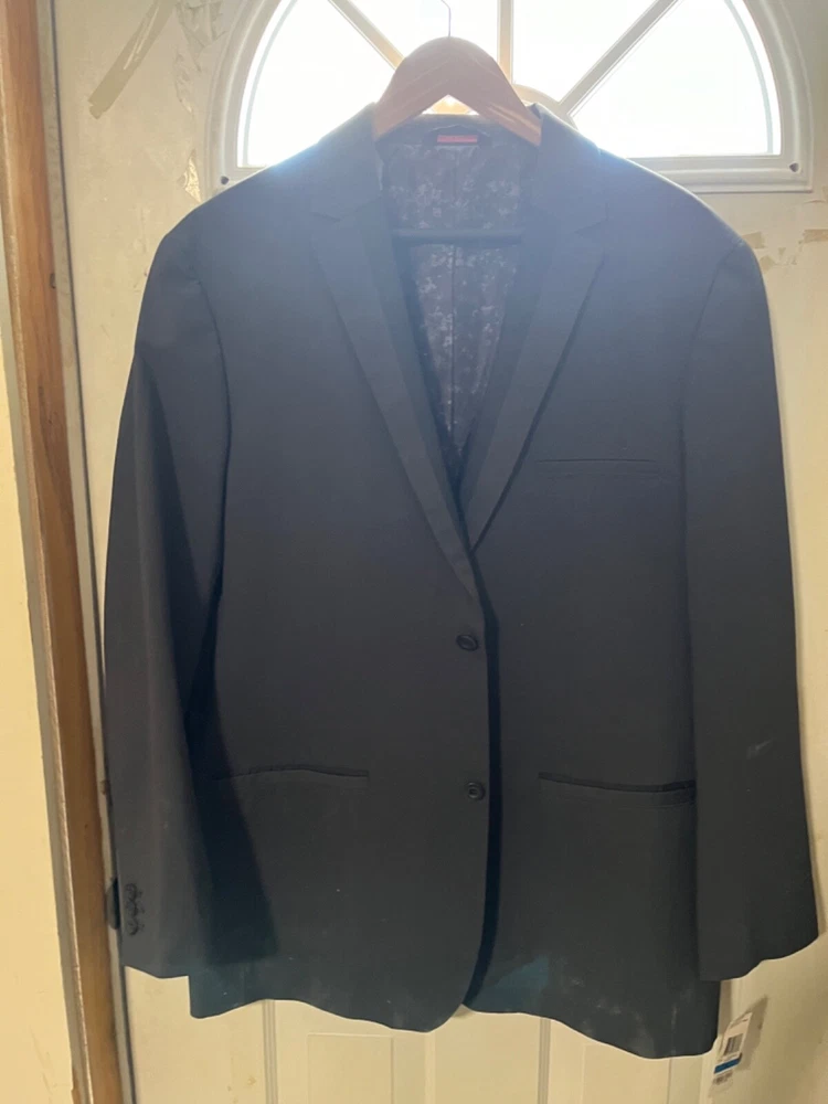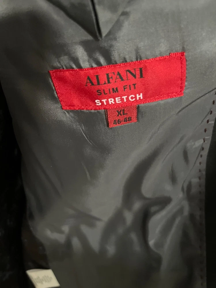 The product is a men's Alfani dress jacket in a size 46/48 XL slim fit stretch, designed in black color. It is a stylish piece ideal for formal occasions or professional settings. The Alfani brand is known for quality and modern designs, .