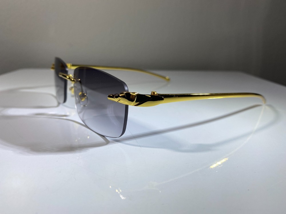 Men's rimless, rectangular sunglasses with gold wire frame and smoke lenses. Great style at great price.