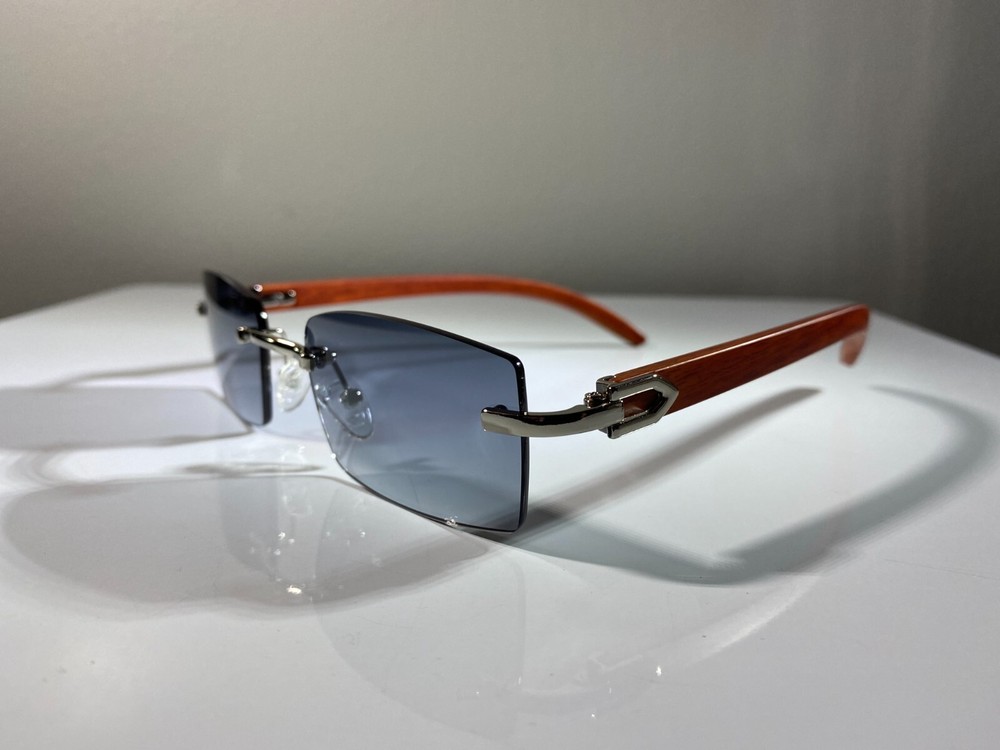 Men's rimless sunglasses with wood grain frame, silver accents & smoke lenses. Classic style at great price.