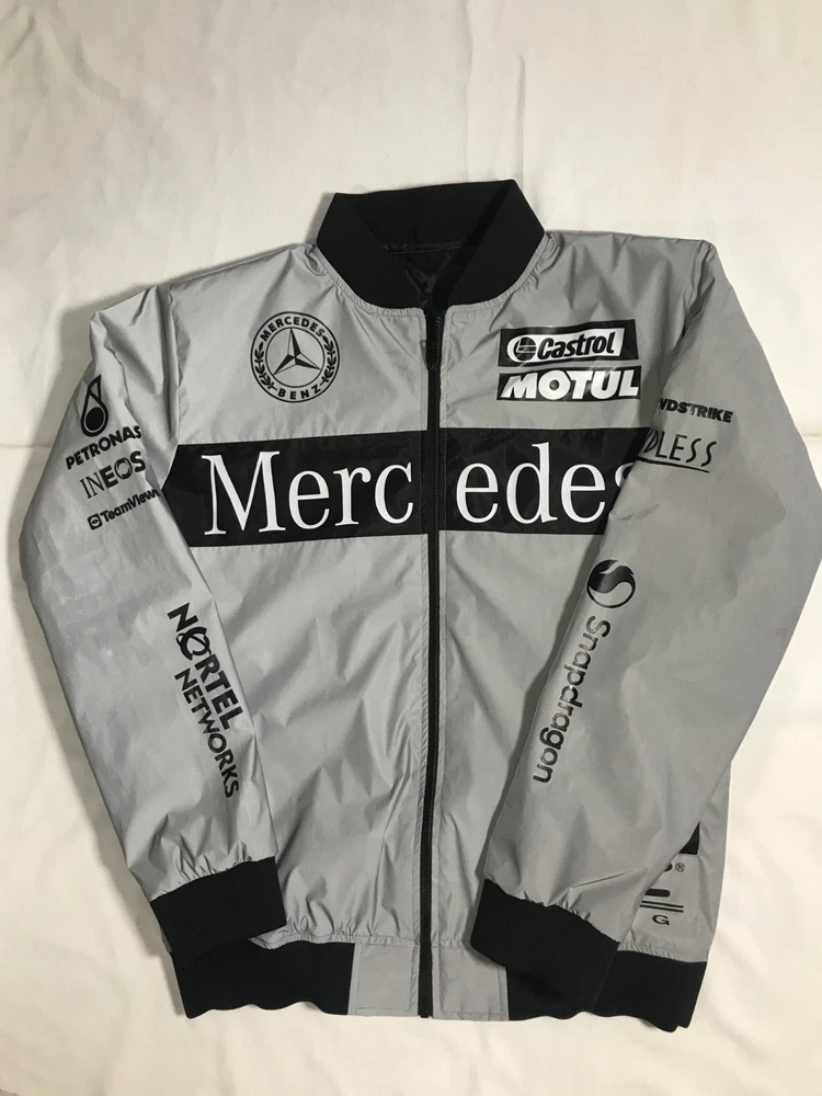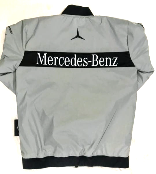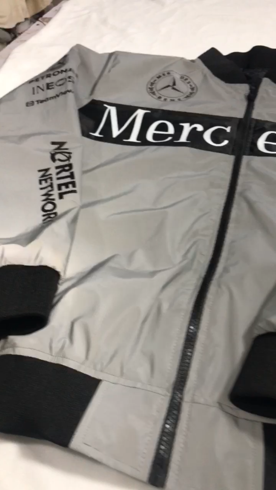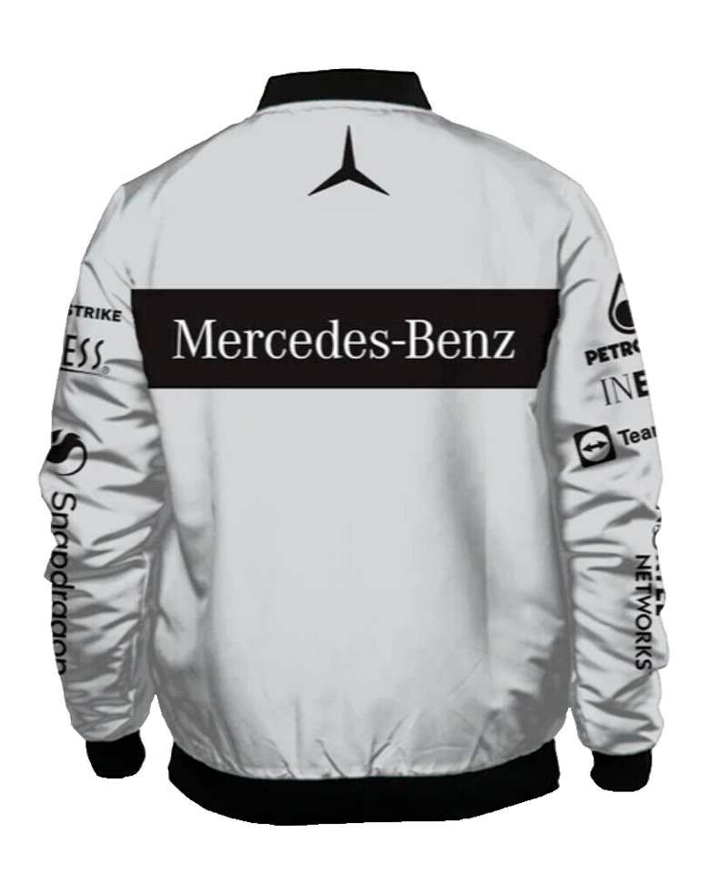 Department: Men Style: Bomber Jacket Model: Easy Rider Accents: Logo Personalize: Yes Jacket/Coat Length: Mid-Length Color: Silver Garment Care: Dry Clean Only Product Line: Mercedes Benz Racing Clothes Brand: Mercedes-Benz Fabric Type: Polyester Sports: Racing-Formula 1 Size Type: Regular Performance/Activity: Racing,Riding Closure: Zip Size: S-3XL Fit: Regular Features: Lightweight,Breathable,Pockets,Full Zip Outer Shell Material: Nylon Insulation Material: Polyester Type: Jacket