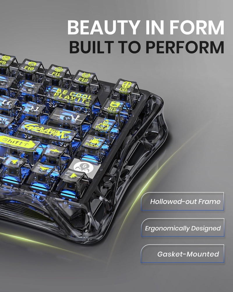⌨Stylish and Unique Design: The Mechanical Keyboard features a hollow and skeletal design that breaks away from traditional keyboard aesthetics, making it a standout piece on any desk. Constructed from durable PVC material, the transparent frame and keycaps maximize the cool backlight RGB effects and wear-resistant appearance. ⌨Comfortable and High-Quality Typing Experience: Equipped with a mainstream gasket structure and x BSUN custom switches, the K1 Lite provides soft key feedback and a comfortable typing experience, perfect for both gaming and typing. The five-layer internal design ensures high-quality keypress sound, producing crisp and concentrated audio. ⌨Tri-mode Connectivity: Keyboard Supports 2.4GHz wireless connection (1K Hz polling rate), Bluetooth 5.0, and wired (8K Hz polling rate)connections, offering seamless compatibility with Windows XP up and MacOS. It can be connected to up to three devices at the same time, and switch between them easily by FN and key combination keys. No limits about your keyboard connection to meet the needs of work, gaming, and study. ⌨RGB Lighting Effects: The Gaming Keyboard features 13 Different RGB lighting modes to choose from, providing a customizable and immersive experience. Advanced customization with Control Center software complete control over your RGB lighting system effects, including brightness, speed, and color. The app is compatible with all active versions of Windows, including XP, 7, 8, 8.1, 10, and 11. ⌨Reliable Battery Life: Featuring a lightweight 4000mAh lithium-ion battery, the Wireless Keyboard stores enough power that you might even forget it needs charging. With up to 235 hours between charges*, it can keep up with the longest marathon gaming sessions, anywhere they may take you. When it finally does need a charge, connect the included USB-C cable to replenish your power without interrupting your game.