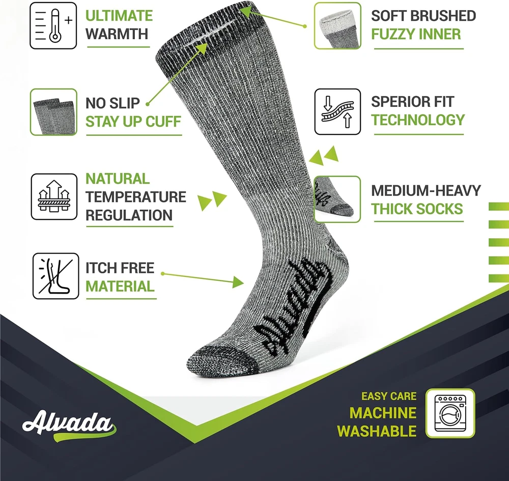 A famously warm material, wool is a common choice for cold weather clothes, especially winter socks. Wool naturally traps in body heat with ease, better than most other materials, making it an easy choice. The famously itchy nature of standard wool can put people off of wearing it, however. Thanks to the super soft merino wool in the Wool Socks, you can take advantage of the warmth offered by wool without any of the itchiness. The Wool Socks are made of 80 percent merino wool that is super soft against the skin and won't cause itchiness or other irritation. This material is also naturally capable of regulating body temperature; even though it locks in heat, it won't make you feel too hot or overheated. The socks also work to keep your feet nice and dry thanks to two properties: moisture-wicking fibers and ventilation channels. The ventilation channels promote airflow throughout the sock to keep you cool, while moisture-wicking fibers absorb sweat and eliminate foot odor. Along the bottom of the Wool Socks is a full cushion footbed that offers padding from end to end. Each pair of socks is designed to carry you through your day without feeling damp or hot and while still feeling well supported. Thanks to the inclusion of reinforced yarn, the heel and toe are both resistant to tears, holes or other such damage, ensuring they last a long time. The Wool Socks are manufactured using a blend of 80 percent wool, 15 percent polyester, four percent nylon and one percent spandex. They provide a great mix of warmth, strength and stretch. They are available in two sizes: small-medium and medium-large. Small-medium fits men's shoe sizes 5 to 9.5 and women's shoe sizes 6 to 10.5. Medium large fits men's shoe sizes 9.5 to 14 and women's 11 to 15.