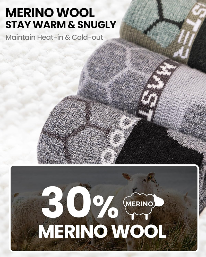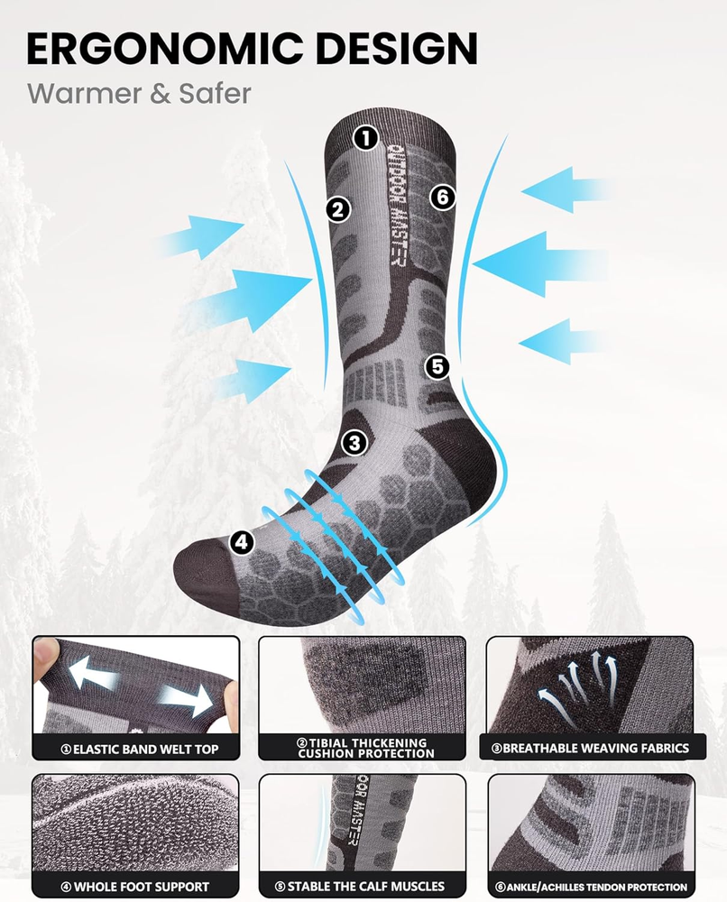 Merino Wool Imported Size: M(US MEN: 4-6.5/US WOMEN: 5.5-7.5), L(US MEN: 7-9.5/US WOMEN: 8-11), XL(US MEN: 10-13/US WOMEN: 11.5-14.5) BREATHABLE, WARM & COMFORTABLE - Made of 30% Merino Wool blend that is LIGHTWEIGHT, BREATHABLE and PREVENTS build-up of SMELL. It also helps keep feet dry due to moisture wicking properties and special breathable weaving technology. OVER CALF DESIGN & STAYS UP - High calf design & elasticity for the ULTIMATE COMFORTABLE FIT. Perfect for skiing, snowboarding and other snow sports. Equipped with NON-SLIP CUFF that ensures that the sock stays up. Socks slipping down in the boots is a thing of the past! COMPRESSIVE FUNCTION & Foot/CALF SUPPORT - Compression fuction provides a mild squeezing action to support enhanced Increase circulation. Thicken design for ankle/arch/achilles tendon offering more protection during outdoor sports. ITCH-FREE, MADE TO LAST, EASY TO WASH & BEAUTIFUL PACKAGE BAG - Have an itch-free time out in the snow with this high quality merino wool blend. And afterwards, enjoy great MACHINE WASHABLE quality that is made to last. The package bag makes them a perfect gift item! What You Get: OutdoorMaster 2/3 Pair of OutdoorMaster Ski Socks, our CUSTOMER-FAVORITE 6-month warranty and friendly customer service. Product Description MERINO WOOL & FULL COMPRESSION SKI SOCKS 1 2 3 4 5 6