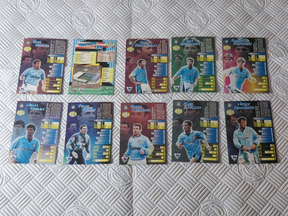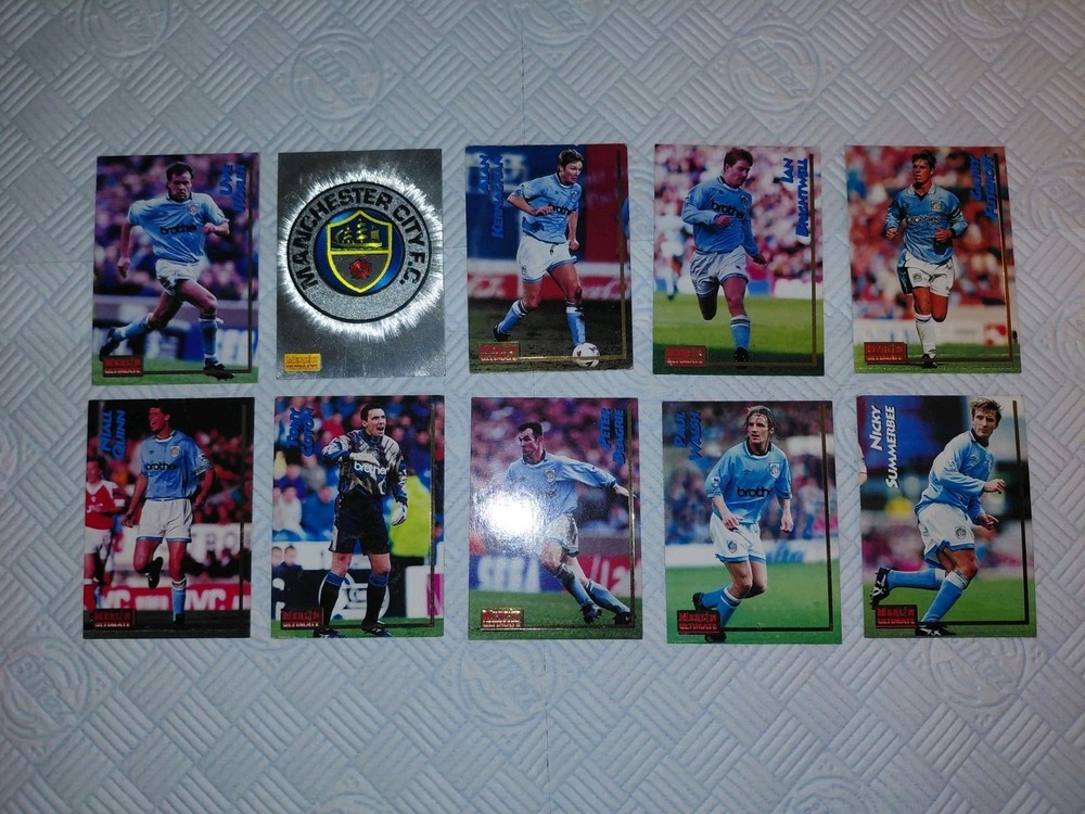 Merlin 1995 Premier league Badge collection cards Manchester City Bundle 10 cards left to right Uwe Rosler City Badge Shiny Alan Kernaghan Ian Brightwell Gary Flitcroft Nails Quinn Tony Coton Peter Beagrie Paul Walsh Nicky Summerbee All fantastic condition not graded. No refunds