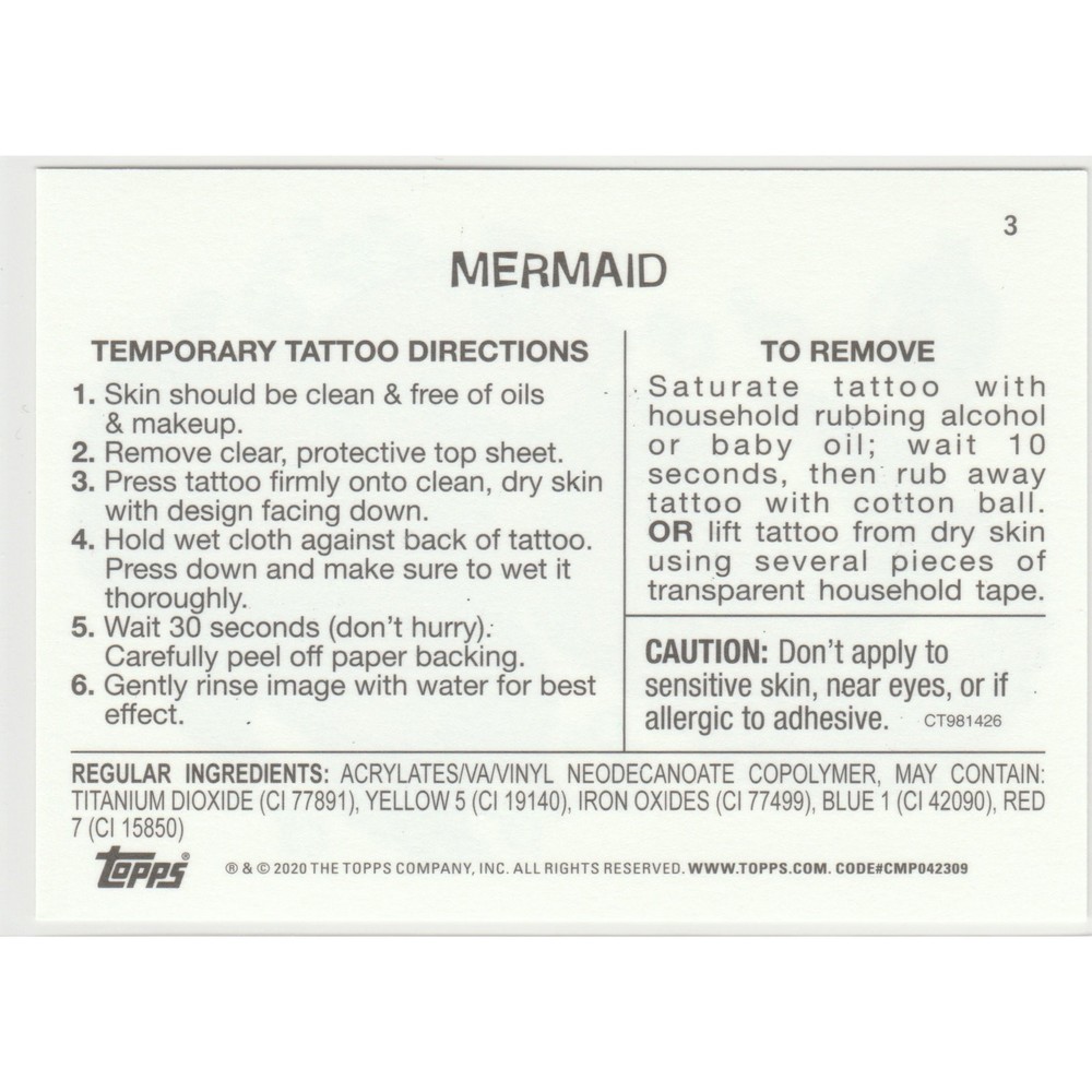 Mermaid #3 Tattoo Garbage Pail Kids GPK 2020 35th Anniversary Series Mermaid #3 Topps Garbage Pail Kids GPK 2020 35th Anniversary Series No Ragerts Tattoo subset chase insert SP short print personal stock photos centering of card may vary compared to listed images