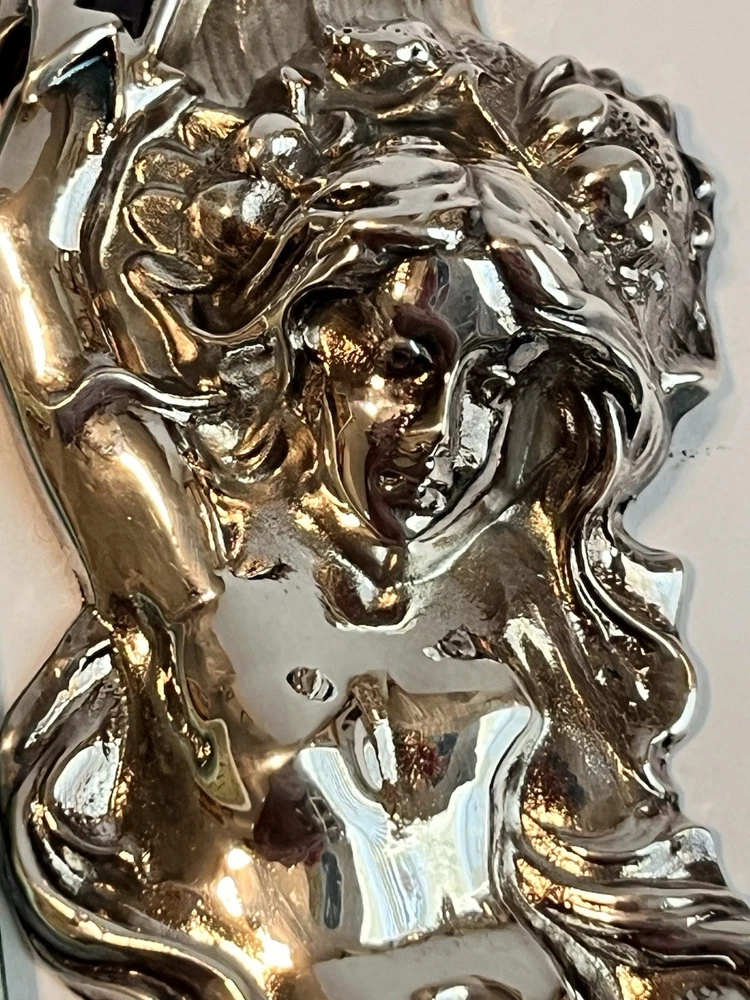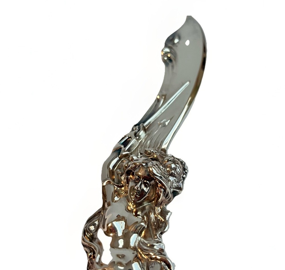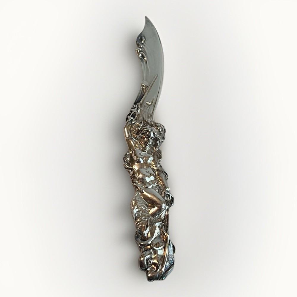 The Mermaid Silver Letter Opener is a vintage piece inspired by the Art Deco Nouveau style, making it a unique and elegant addition to any desk set. This letter opener features intricate detailing and a striking design that is sure to catch the eye. Perfect for those who appreciate the beauty of artistry and the charm of a bygone era, this piece is a true collectible item that will stand out in any collection. In excellent condition.
