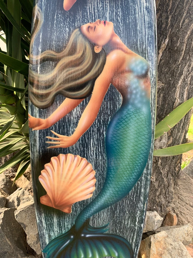 This beautiful hand carved and painted surfboard wall plaque is perfect for Mermaid lovers. The mermaid is beautifully airbrushed in great Detail. It would make a great addition to your home, patio, or tiki bar. It is hand carved from top-of-the-line mango wood, and has a flat back to hang on the wall. This surfboard would make an awesome gift! Can be hung horizontally or vertically. Let us know if you need an extra bracket for horizontally. 39x 10 inches Will eventually start to fade if left out in the sun. We highly recommend an polyurethane gloss spray with UV protection for upkeep.
