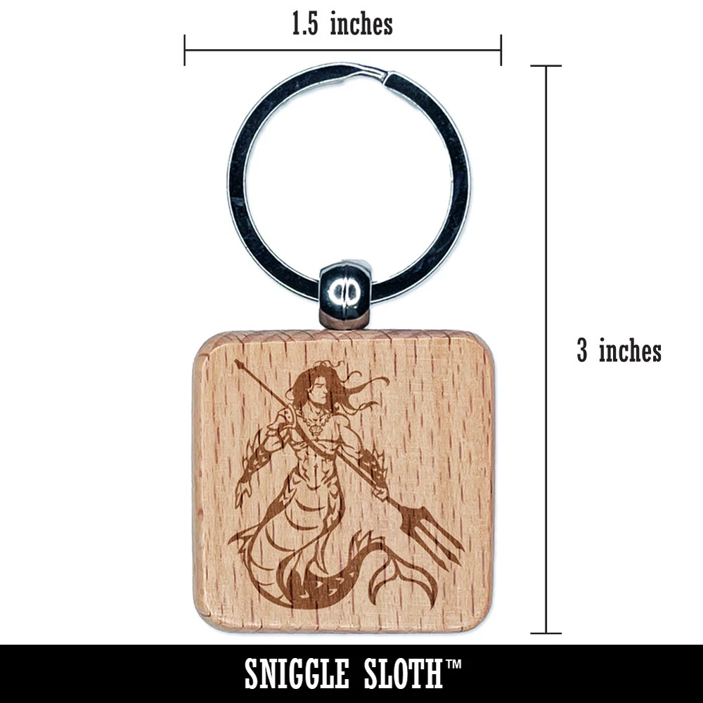 Merman Mermaid Man with Trident Engraved Wood Square Keychain Tag Charm