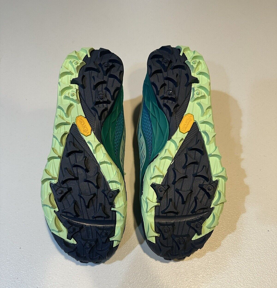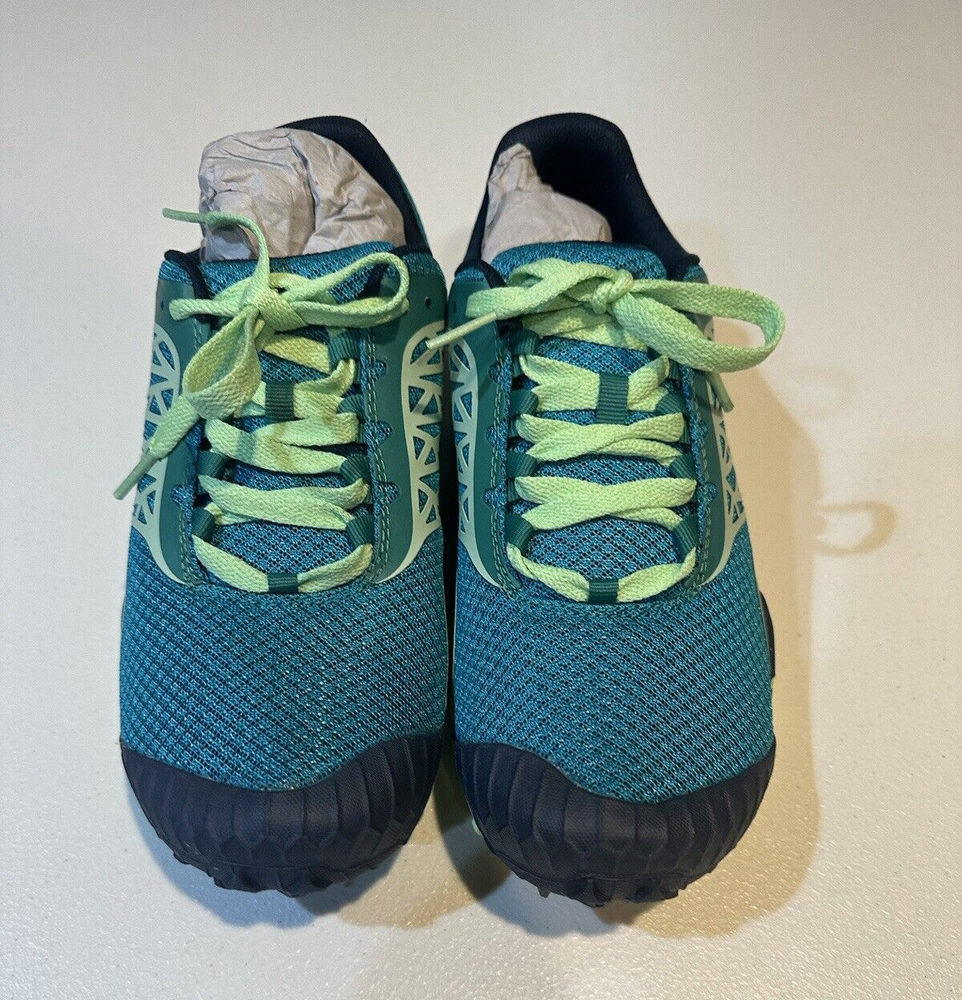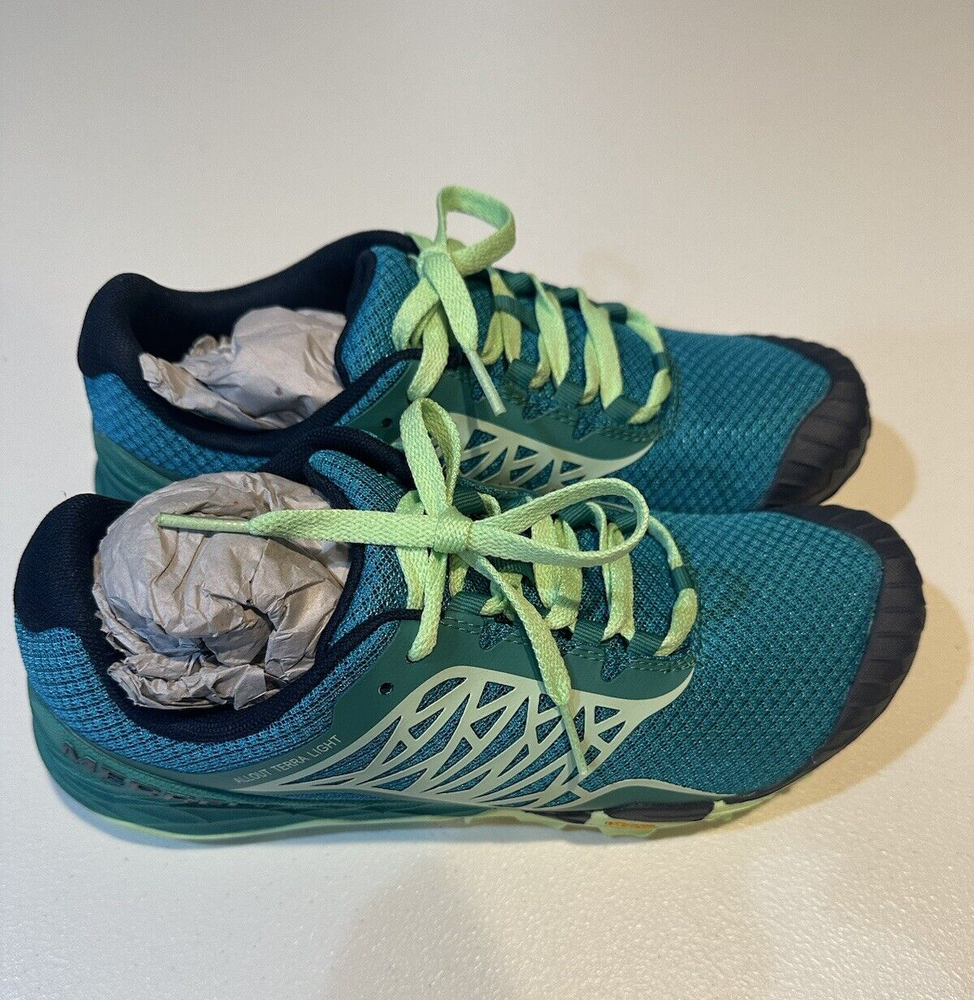Merrell Womens All Out Terra Light Hiking Shoes. Size is 8. Color is Bright Green. Air Mesh/TPU upper - Offers durable, yet breathable coverage. Toe Guard - Extends from the outsole to provide protection against rocks and debris. Synthetic Leather lacing system - Provides a secure fit. Synthetic Overlays - Wraps the foot for a secure fit. Bootie Construction - Acts as a partial gaiter to keep debris from getting inside the shoe and secures the heel when running through deep mud.