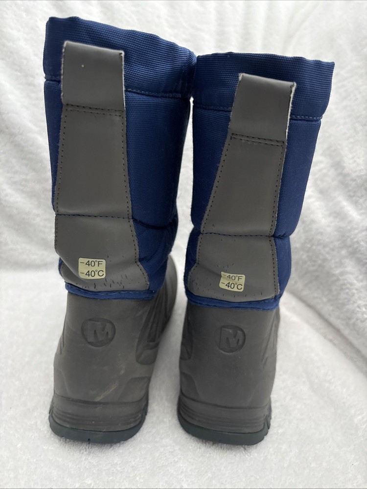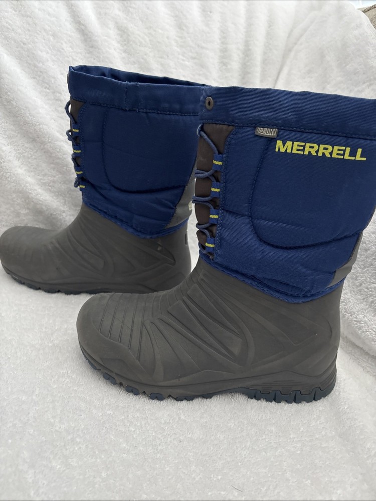 The Merrell Boy’s Snow Boots are designed for outdoor activities in winter, fall, and spring. These waterproof and insulated boots feature a round toe shape, pull-on closure, and moderate cushioning level for comfort. The blue and gray color combination and logo accents add a stylish touch to the snow boot style. Made with Thermolite insulation and a rubber outsole, these boots are perfect for snow and hiking adventures. Perfect for boys who love the outdoors, these Merrell boots are a practical and fashionable choice for active wear.