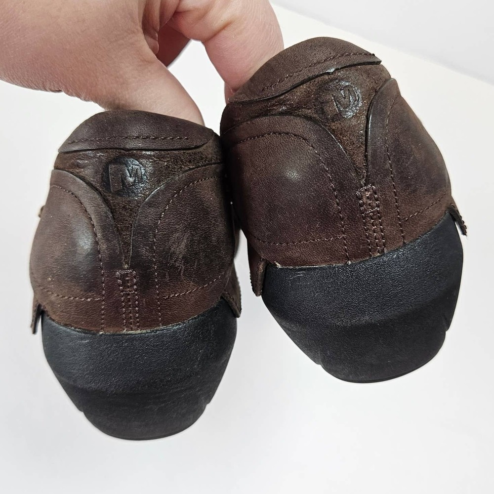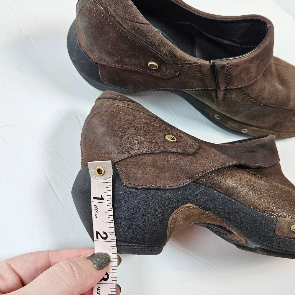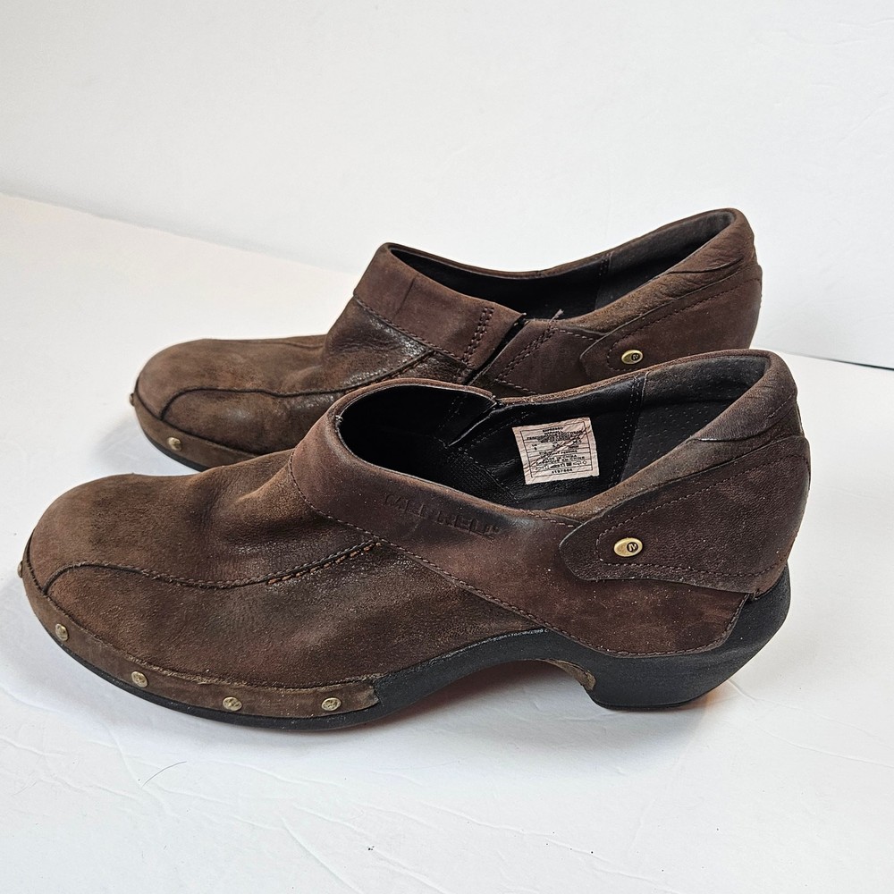 Merrell Luxe Wrap Espresso Brown Leather Clogs Studded J68680 Women 8 Slip on Rubber heel Clog Studded detail Uppers: Leather Balance: Manmade j68680 Women's 8 UK 5.5 EUR 38.5 Heel is about 2" casual everyday comfort unique business professional aesthetic edgy walking neutral cottage cabin outdoor earth tone Excellent pre-owned condition, no rips, tears or stains. Smoke free, dog friendly home.