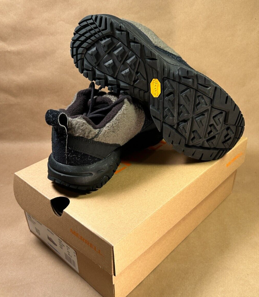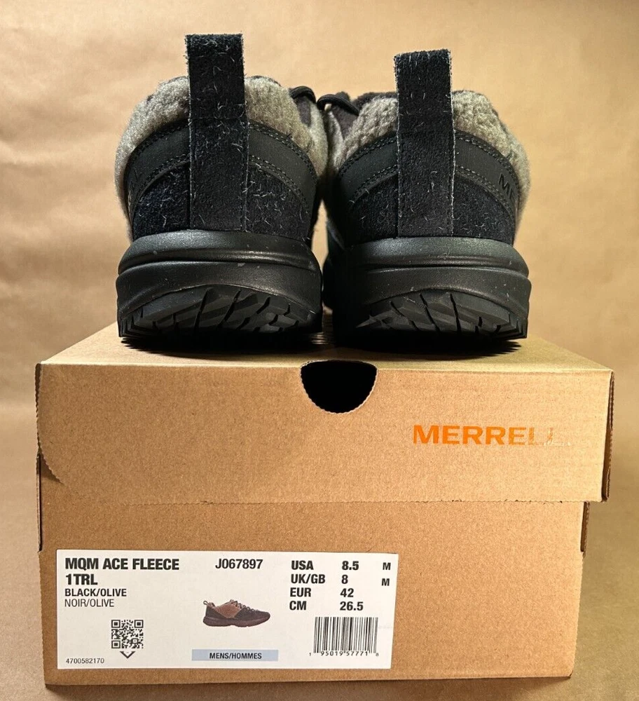 Brand new in box. MSRP $160.00. This stylish yet ruggedly comfortable shoe features trademark Merrell detail and craftsmanship... • Pig suede leather and wool upper • 100% recycled laces • Bellows tongue keeps out debris • Protective and abrasion resistant rubber toe cap • Fleece lining • 100% recycled mesh footbed cover • Cleansport NXT™ treated for natural odor control • 50% recycled removable EVA foam footbed • Molded nylon arch shank • Merrell Air Cushion in the heel absorbs shock and adds stability • Rock plate for protection • Super Rebound Compound midsole with 10% recycled flecks provides durable shock absorption to help reduce torque and allow for a smooth transition into the midfoot • Vibram® Ecostep Recycle outsole designed with 30% recycled rubber which provides added durability and improved grip on wet and dry surfaces Black and Olive. J067897. Men's size 8.5 US (8 UK, 42 EUR). Buyer pays calculated shipping. Thanks for bidding!
