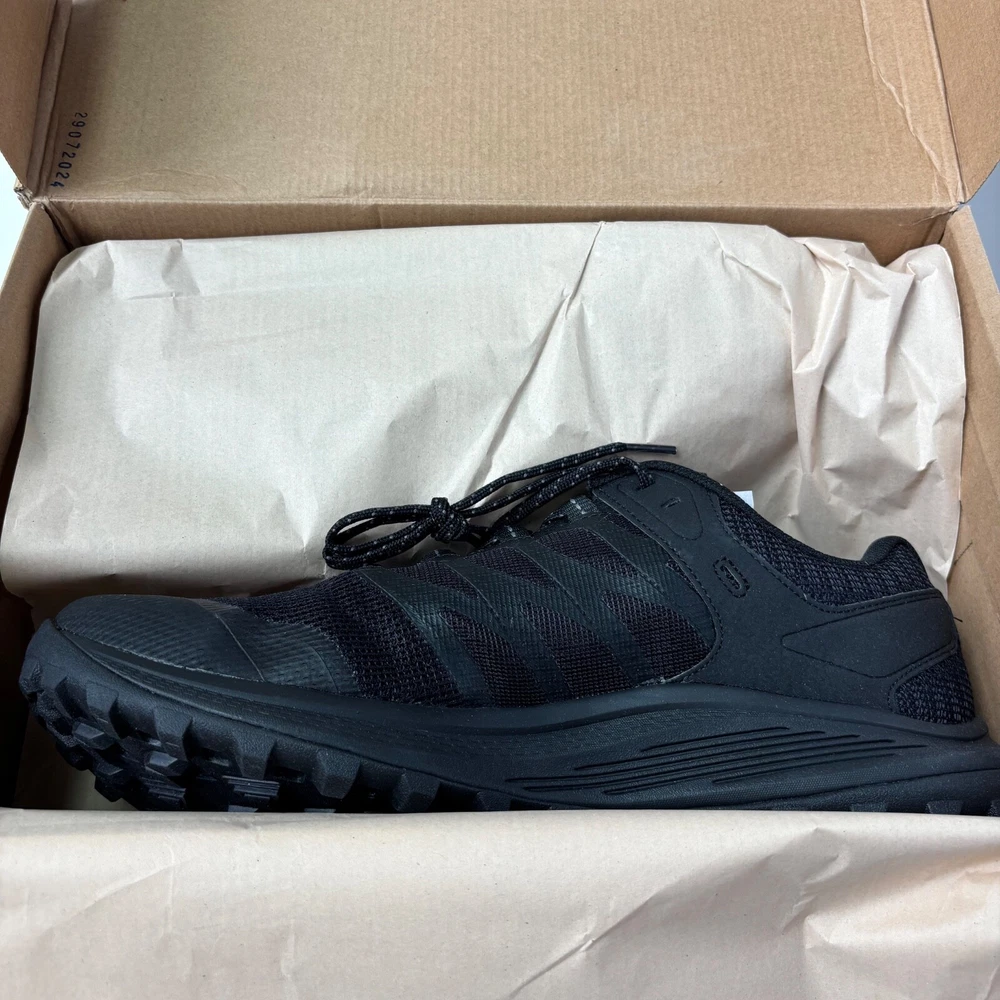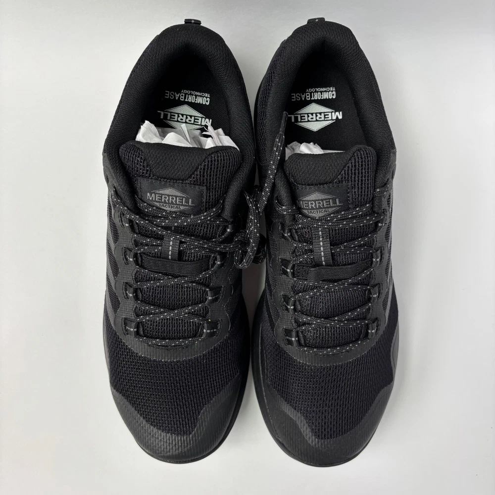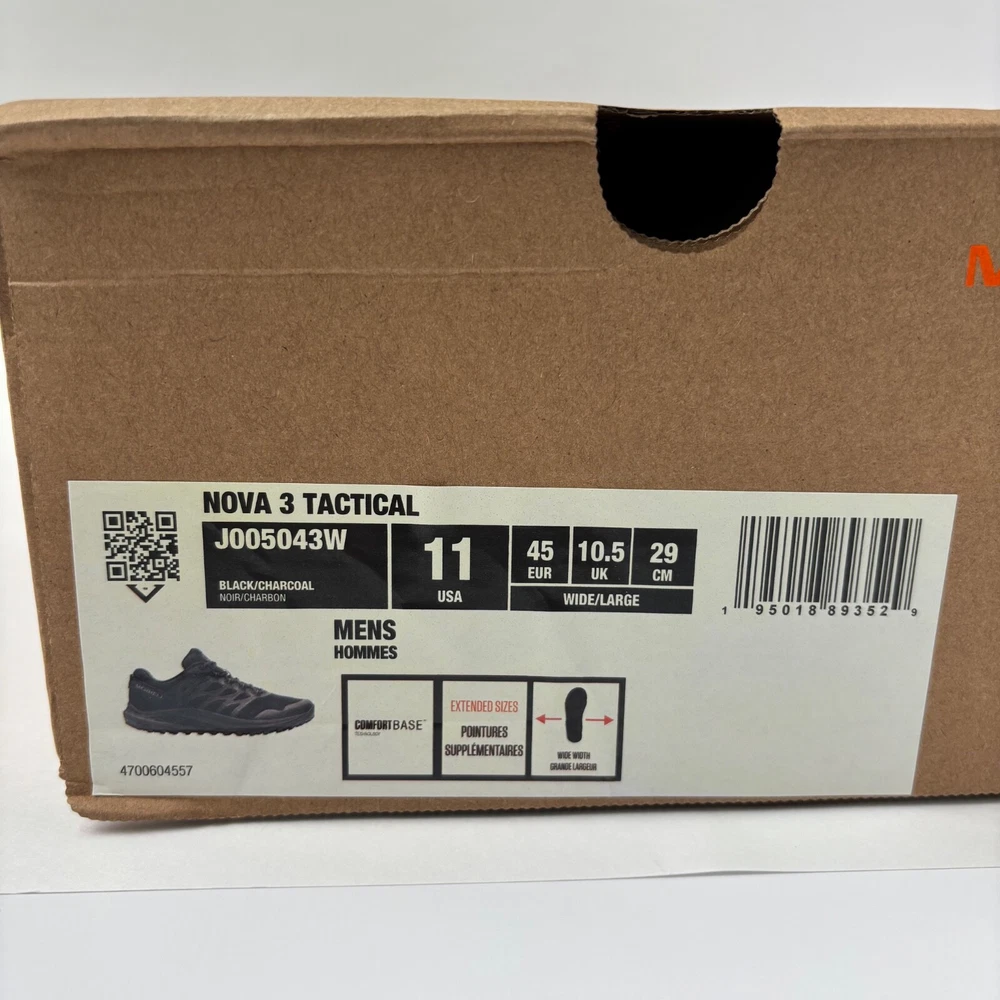 Item: Merrell Nova 3 Tactical Men's Trail Running/Hiking Shoes Condition: Brand new. Never worn. Comes with original packaging. Size: Men's 11 US Width: W (Wide) Color: Black/Charcoal Model Number: J005043W Features: Designed for tactical performance and trail durability Breathable mesh and TPU upper Vibram® TC5+ outsole for traction on mixed terrain FloatPro™ foam midsole for lightweight cushioning Rock plate for protection Heel pull tab and padded collar Vegan-friendly materials What’s Included: 1 pair of shoes (left and right) Original box