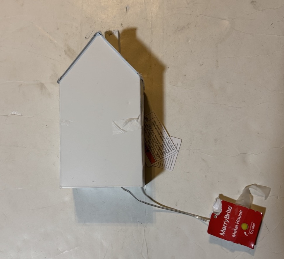 Add some holiday cheer to your home decor with this Merry Brite Metal Christmas House. The asymmetrical, metallic finish house measures 9 inches in length and 4.5 inches in width, making it a medium-sized piece suitable for any room. It features lights and a snow pattern, perfect for creating a festive atmosphere. This original, unboxed house is part of the Merry Brite collection and is an ideal gift for adults who love Christmas villages. Handmade in China, this house weighs 10 ounces and is easy to display on any piece of furniture. Add this charming piece to your collection and bring the holiday spirit into your home.