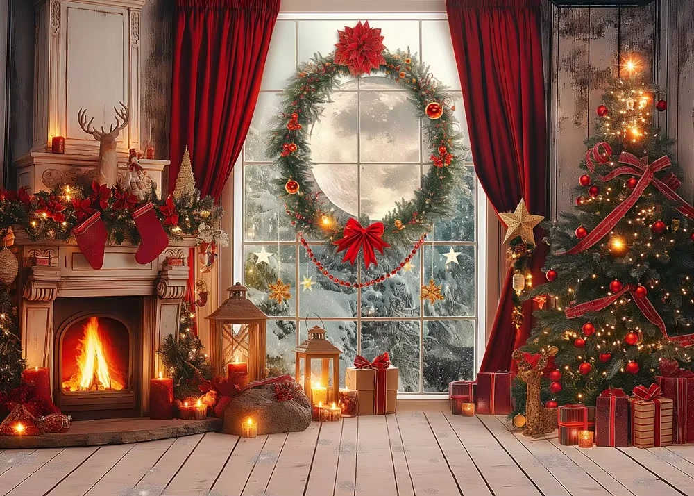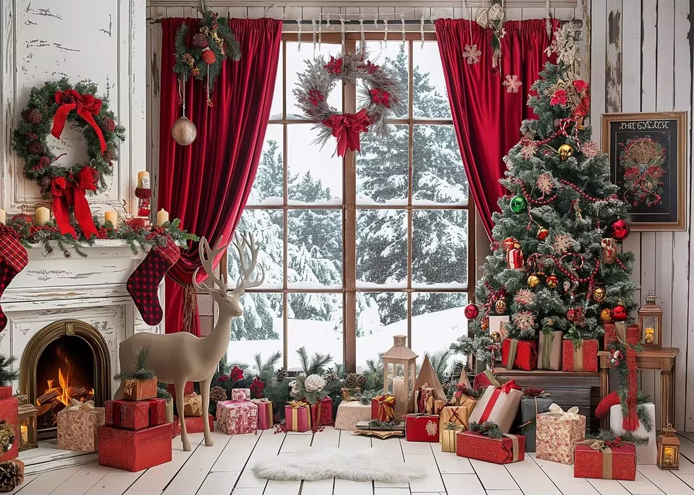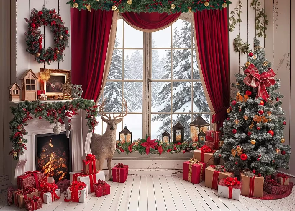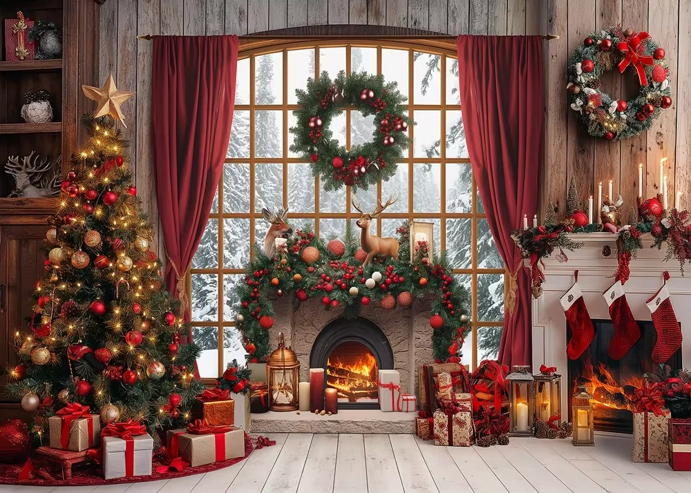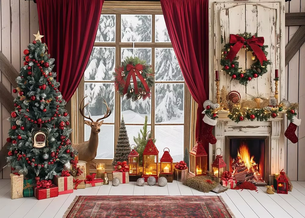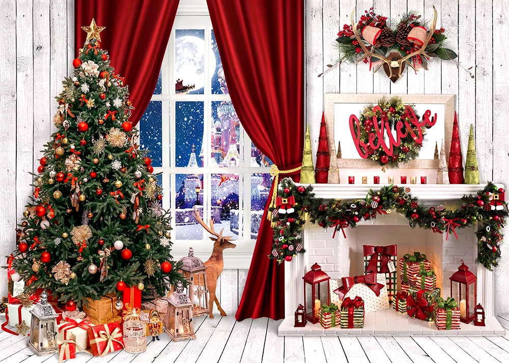 Merry Christmas Backdrop Photography Winter Wood Window Door Xmas Tree Backgroun