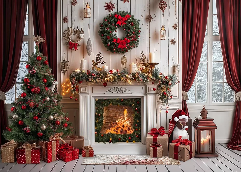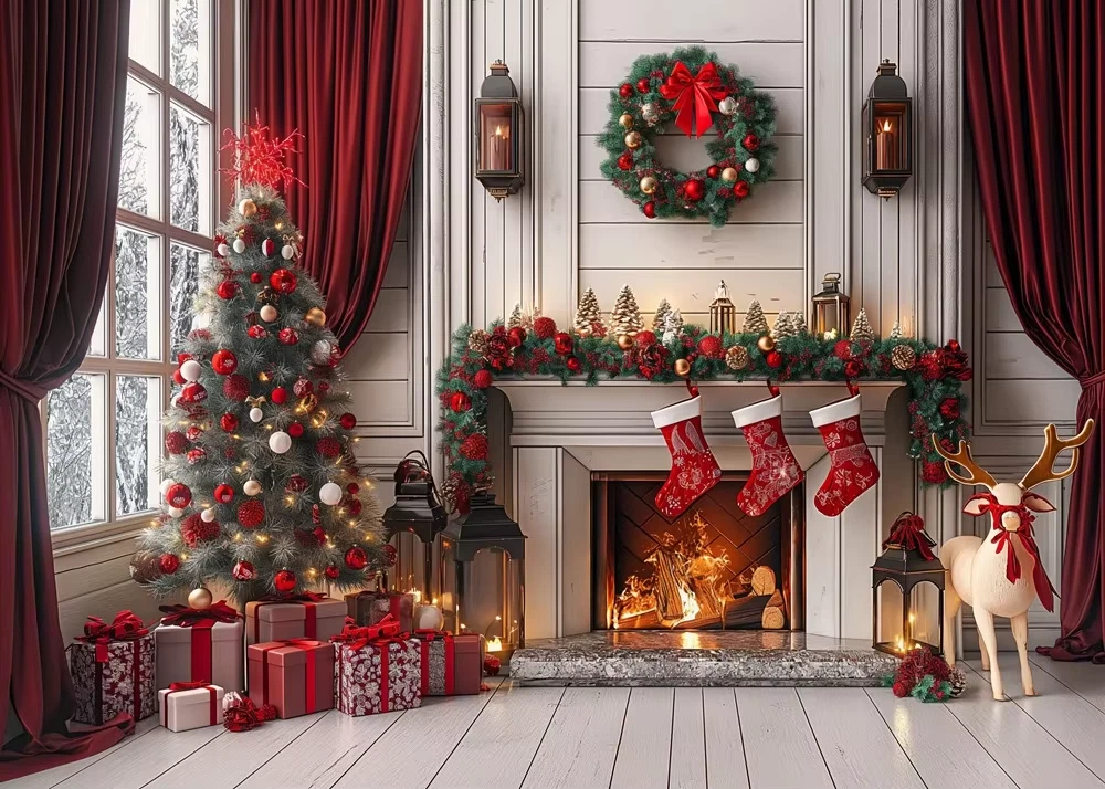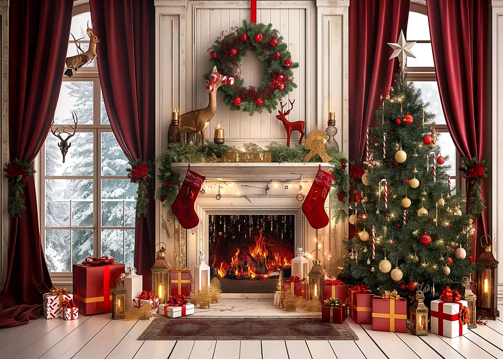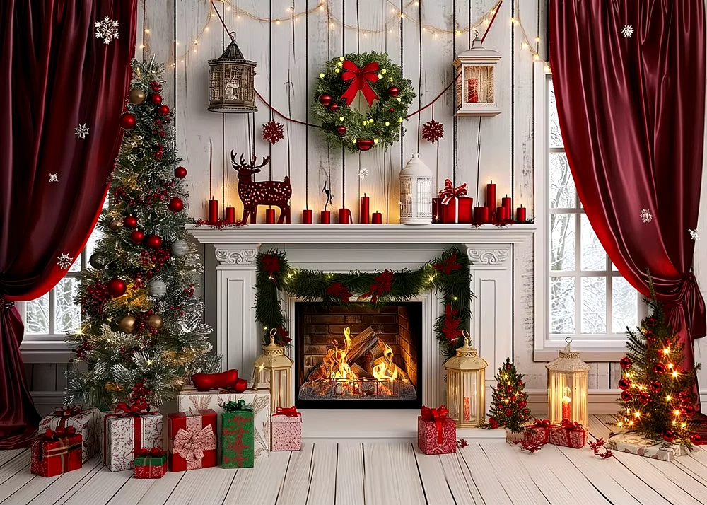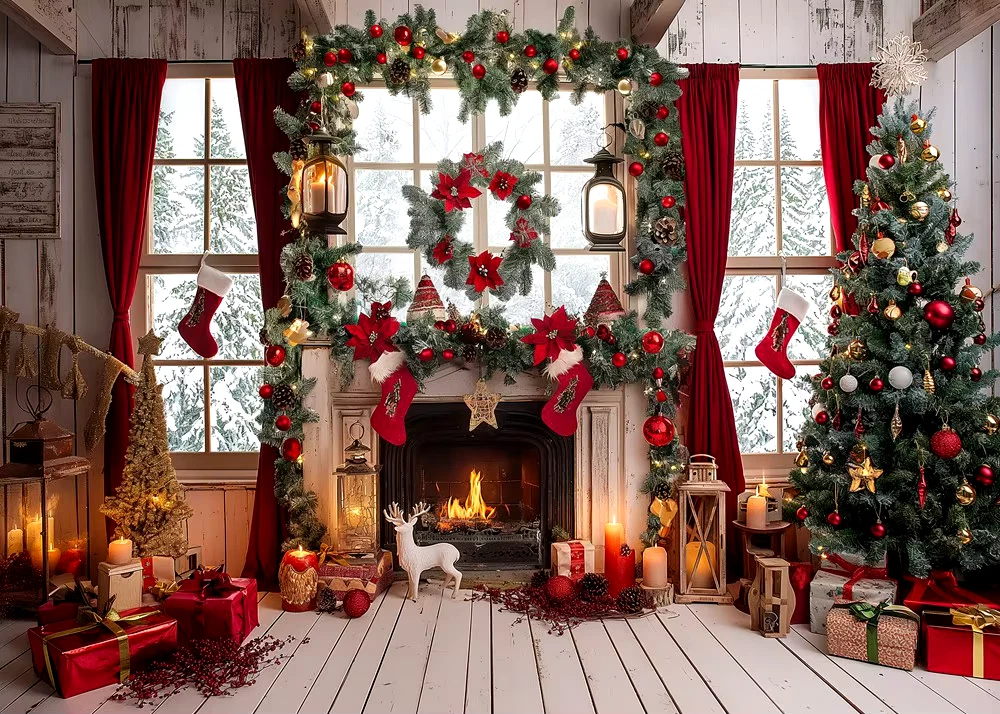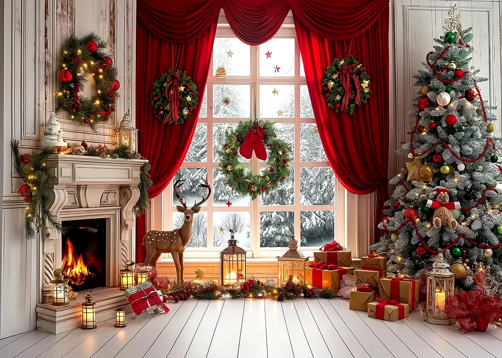 Merry Christmas Backdrop Photography Winter Wood Window Door Xmas Tree Backgroun