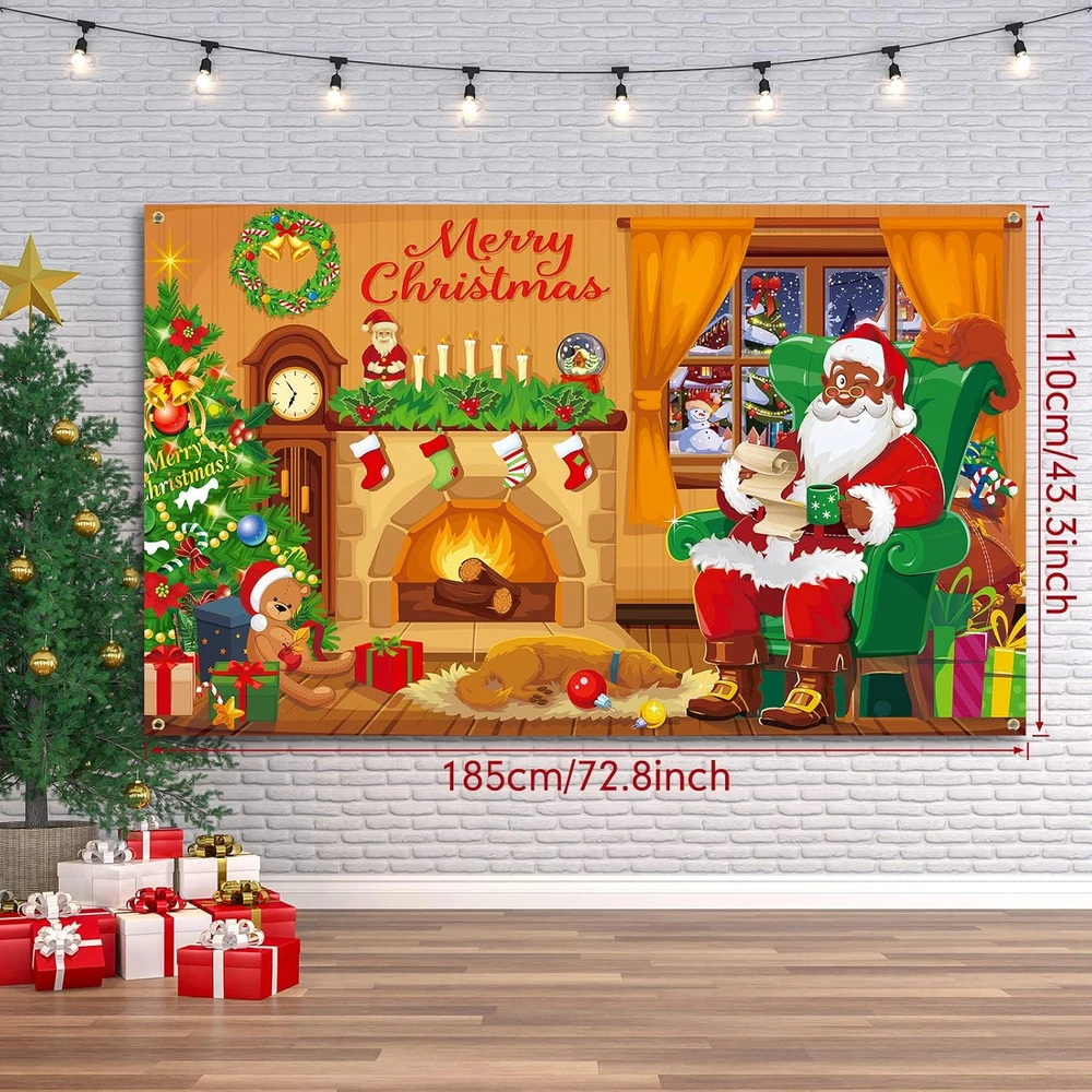 Menu Other Items Feedbacks About Us Contact Us Add To Favorites Merry Christmas Backdrop Xmas Black Santa Claus Background Decoration for Photography Fireplace Wall Hanging Banner Photo Booth Prop for Winter Home New Year Holiday Party Favor Supplies What You Will Receive: you will get 1 piece of Christmas backdrop with 4 holes on 4 corners, and equipped with 1 piece of long enough rope to support your different hanging purposes, which is very convenient for you to hang it indoors or outdoors Appropriate Size: the Christmas banner sign measures approx. 185 x 110 cm/ 72.8 x 43.3 inches, and the proper size is suitable to decorate walls and doors, and makes it easy to install and hang in the party theme; In addition, it is also ideal for taking photos with family and friends, leaving an impressive memory for you Christmas Themed Decor: the Christmas backdrop is printed with patterns of the black Santa Claus sitting by the fireplace, Christmas trees colored in classic red and green, snowman and some other Christmas elements, befitting for your Christmas party and making a warm atmosphere to your holiday Quality Material: Christmas photography backdrop is made of quality polyester fabric, with clear and vivid printing, weather resistant and tear resistant, washable and reusable, which is serviceable and can serve you for a long time Wide Range of Use: Xmas photo background is not only a nice decoration for various parties, such as Christmas parties, New Year parties, winter parties, Christmas events, birthday parties, etc., but also recommended as tablecloth, wallpaper, curtain, and photo studio background Product Description Item Specification Product Care Instructions hang it Occasion Christmas Product Dimensions 72.83"L x 43.31"W Item Dimensions L x W 72.83"L x 43.31"W Size 185 x 110 cm SHIPPING FREE FAST SHIPPING FREE SHIPPING We are always working hard to ensure your package arrives as soon as possible. Please understand that some factors like weather, high postal traffic, and the performance of shipping companies are outside of our control. We offer free shipping to the lower 48 states. We do not accept P.O. Boxes. Please provide a physical address. If you have a problem or question regarding your transaction please contact us immediately. We will work with you to resolve any problem you may have. Thank you